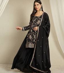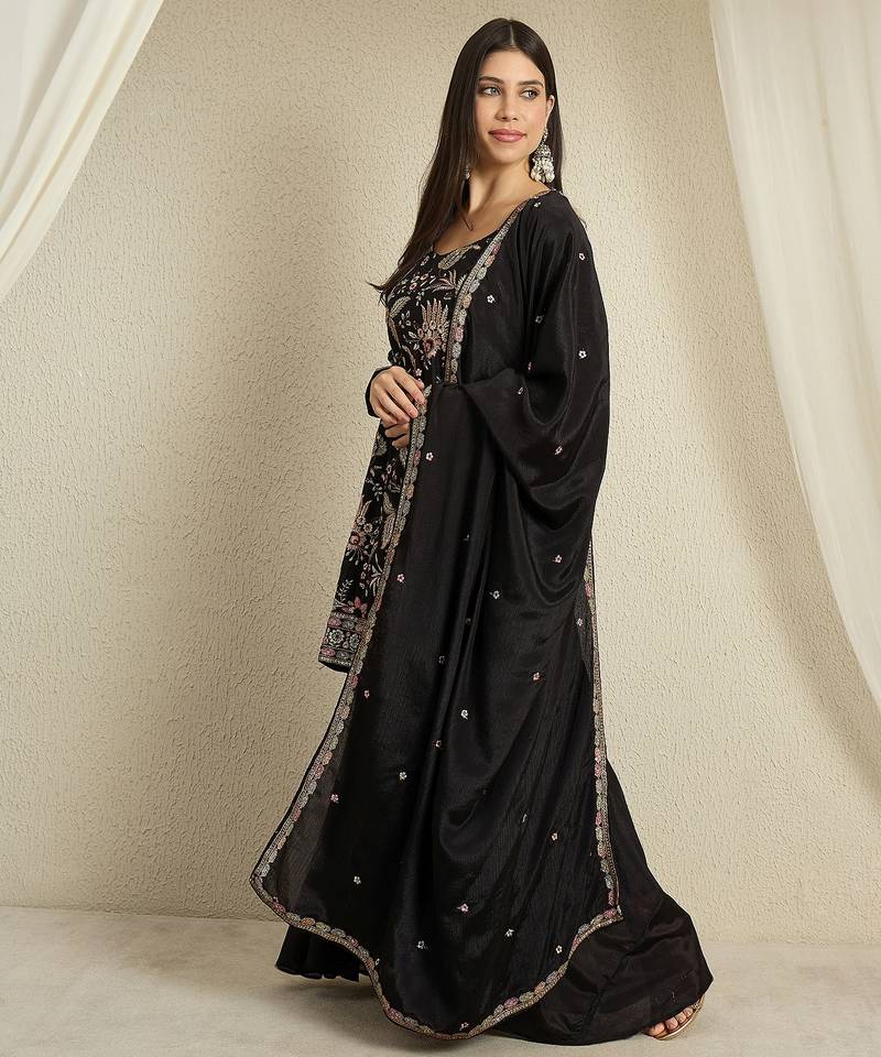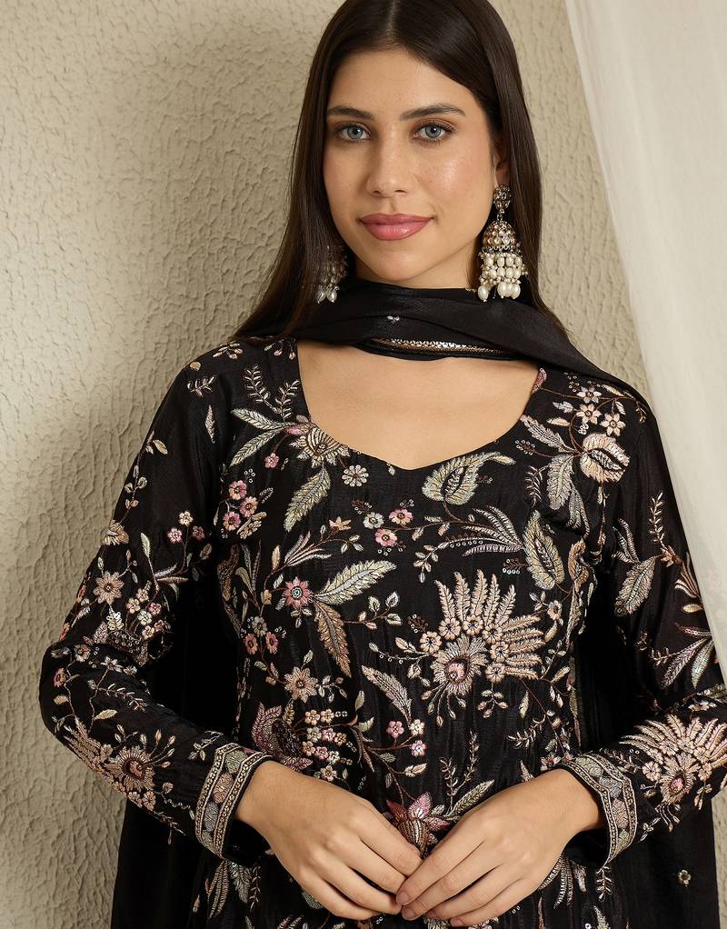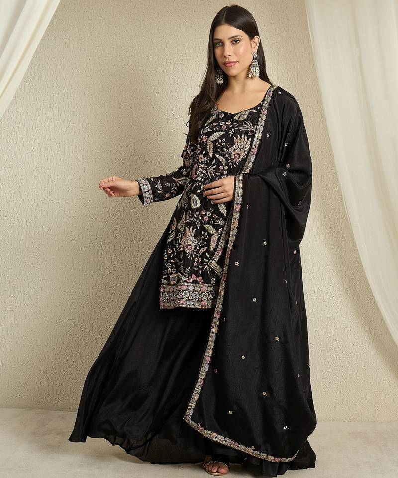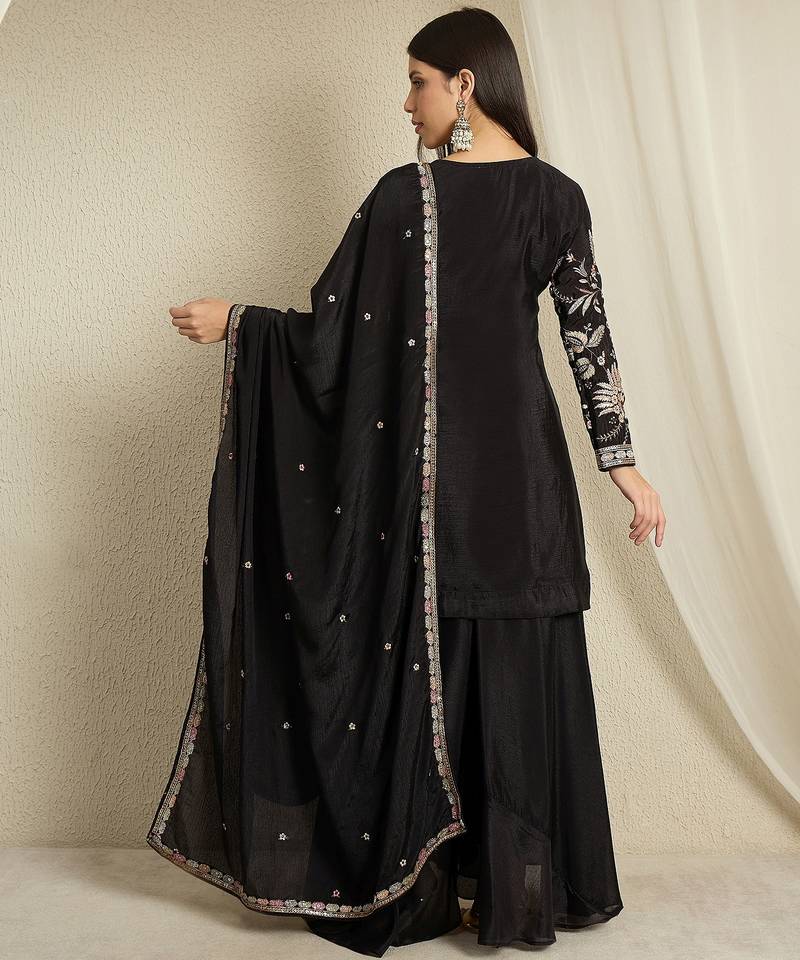 | Product Name | Black Chinon Top With Bottom And Dupatta Full Sleeve Embroidered Kurta Palazzo Set | |