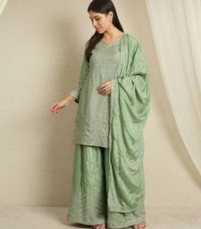 | Product Name | Pista Chinon Top With Bottom And Dupatta 3/4 Sleeve Embroidered Kurta Palazzo Set | |