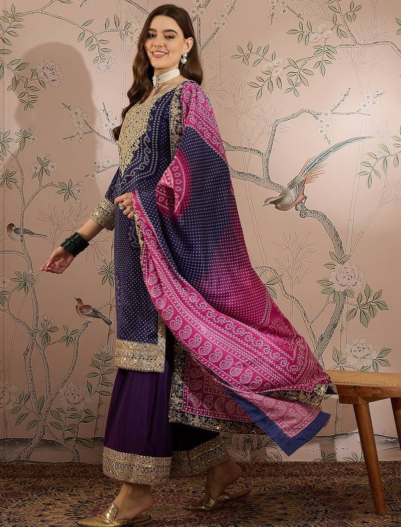| • | Dupatta | : | Color- Purple / Fabric- Silk Blend |