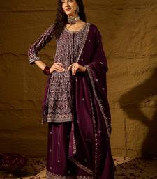 | Product Name | Purple Chinon Top With Bottom And Dupatta Full Sleeve Embroidered Flared Kurta | |