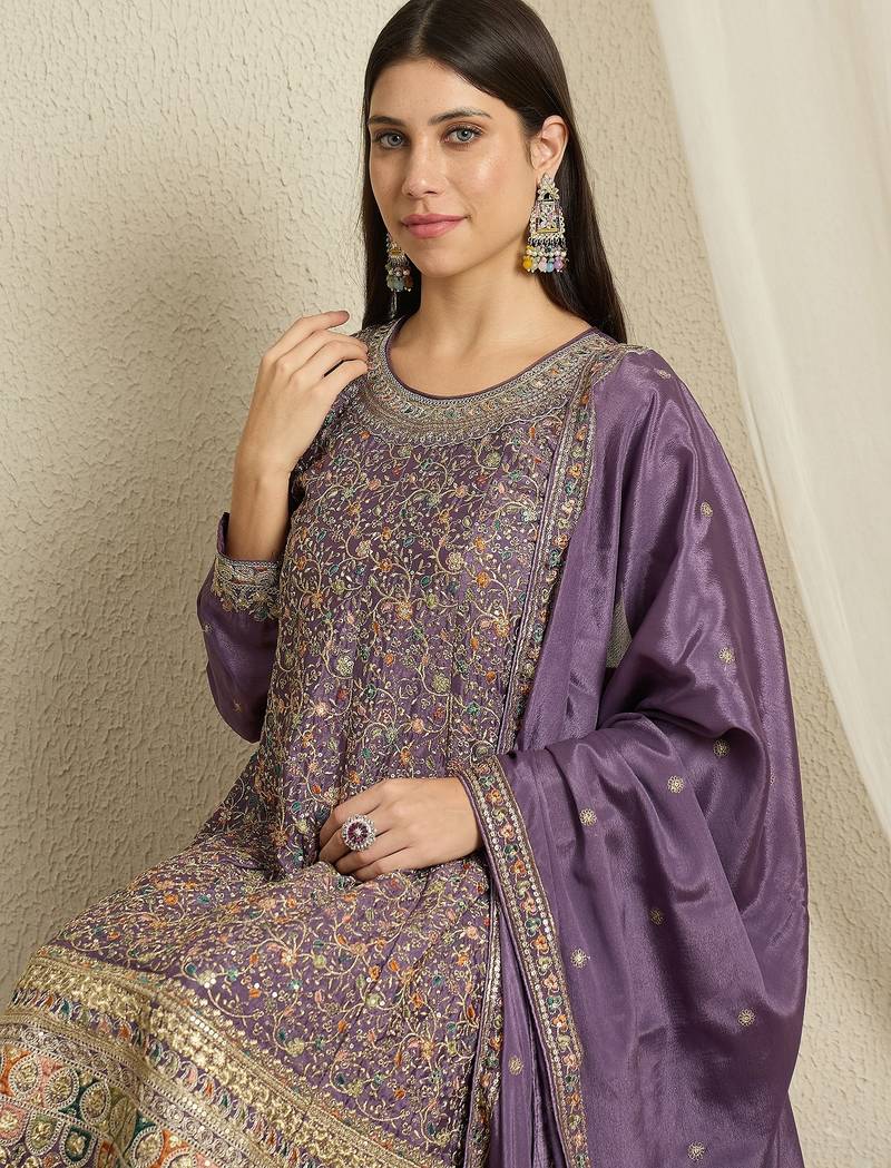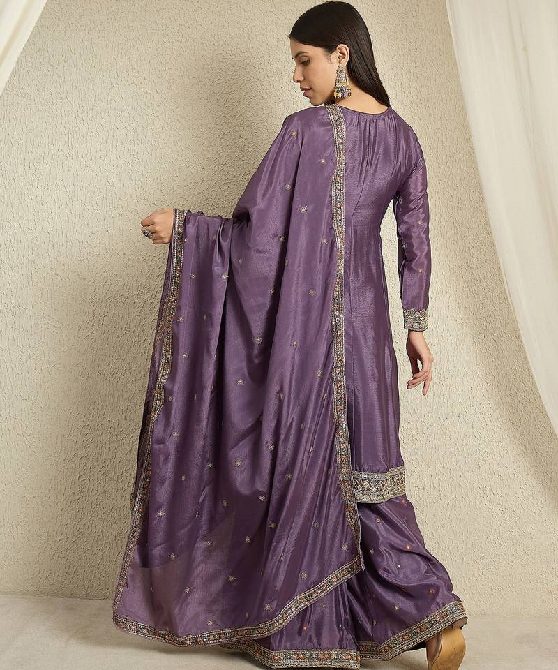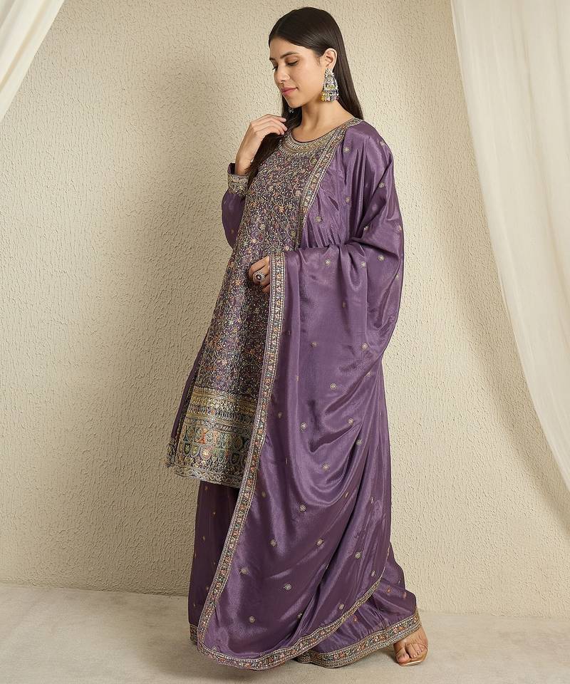 | Product Name | Purple Chinon Top With Bottom And Dupatta Full Sleeve Embroidered Kurta Palazzo Set | |