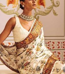 White printed satin saree with blouse piece
