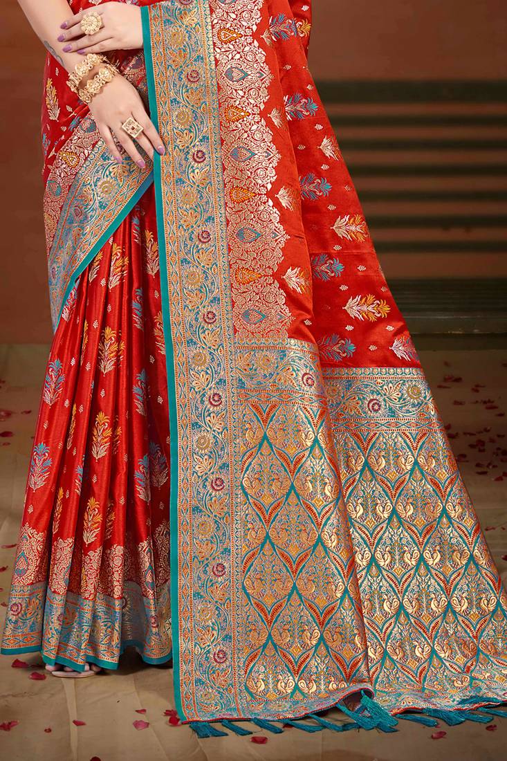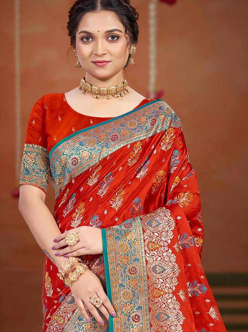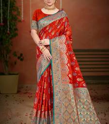 Rust orange satin silk blend woven work traditional saree