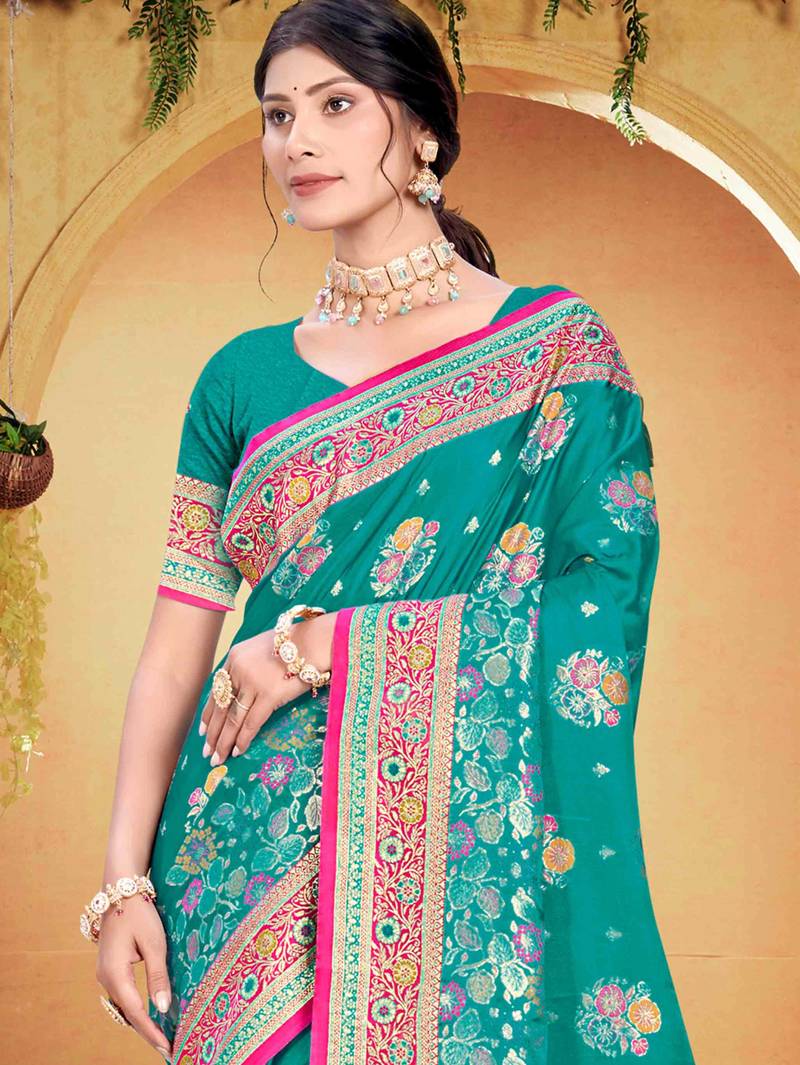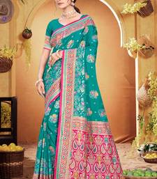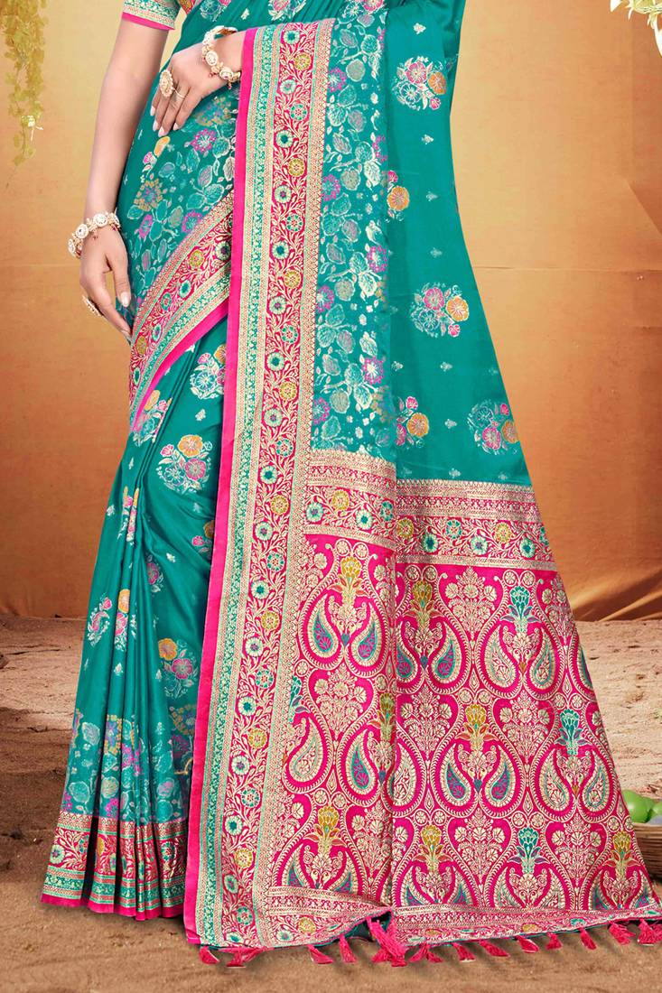 Product Name Teal Green Satin Silk Blend Woven Work Traditional Saree