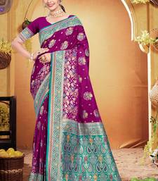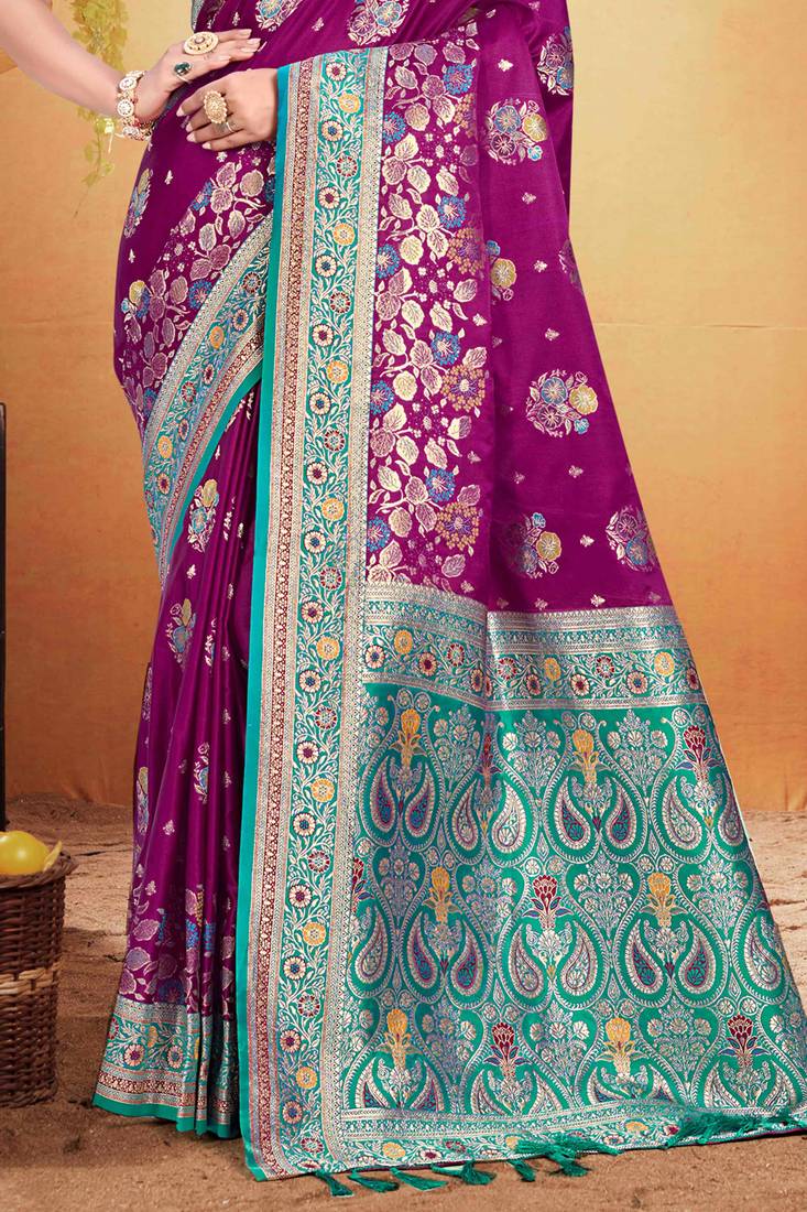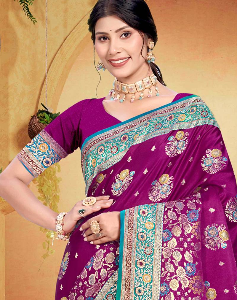 Wine purple satin silk blend woven work traditional saree