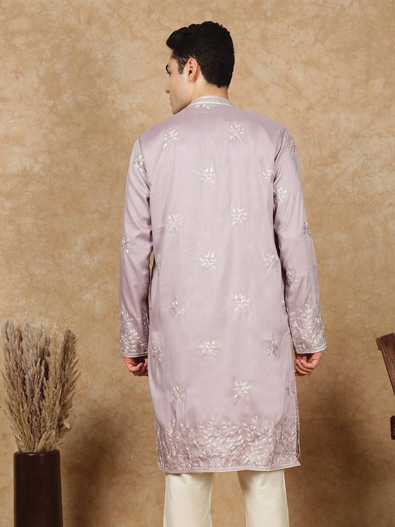 Pink rayon floral kurta for men