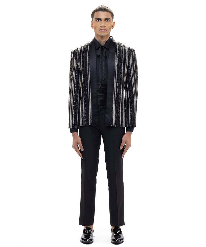 | Product Description | This Black Embroidered Woolen Blend Tuxedo Set Embodies Refined Sophistication With A Winter Ready Appeal. Crafted From A Premium Woolen Blend, It Features Elegant Embroidery That Enhances Its Luxurious Look. Ideal For Formal Evenings And Special Occasions, It Offers Warmth, Comfort, And A Sharp, Timeless Silhouette.