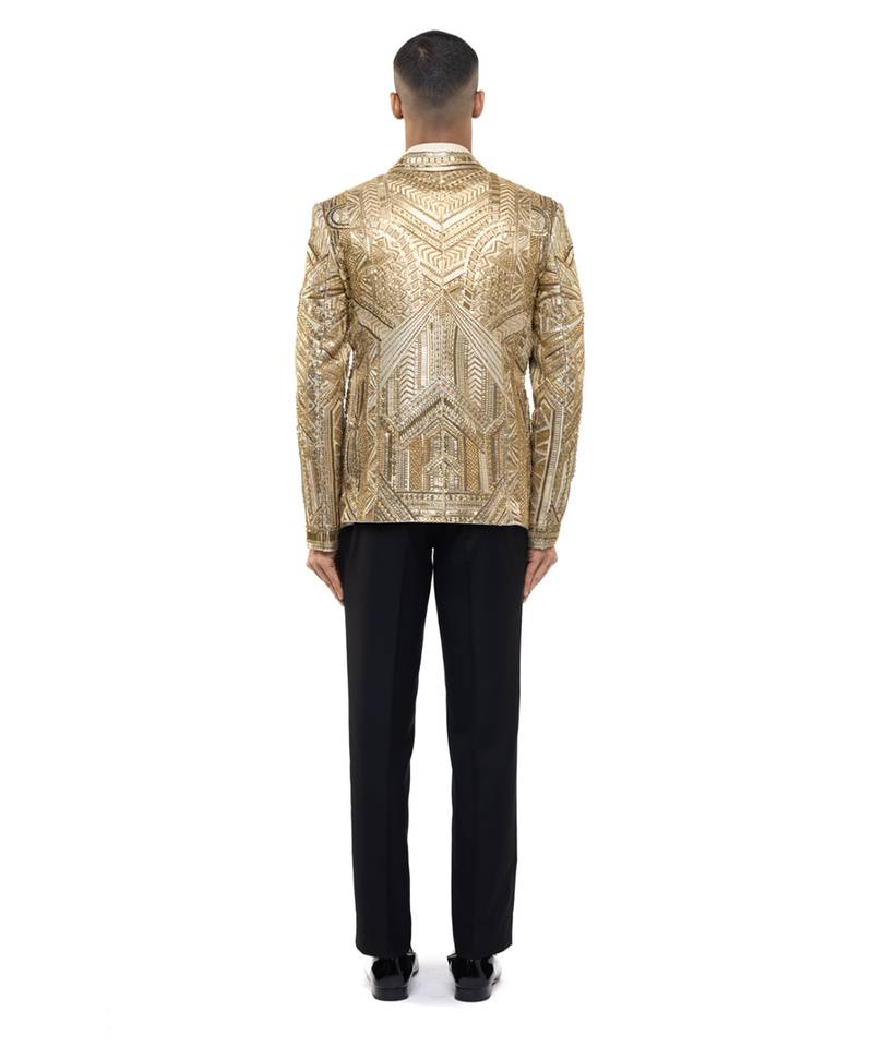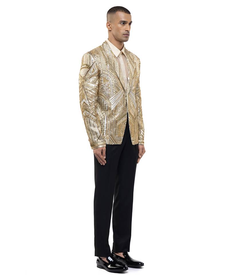 | Product Description | This Gold Embroidered Silk Tuxedo Set Radiates Opulence And Refined Elegance. Crafted From Luxurious Silk Fabric, It Features Intricate Gold Embroidery That Adds A Rich, Statement Finish. Perfect For Grand Celebrations And Evening Occasions, It Offers A Sharp Silhouette, Premium Comfort, And Timeless Sophistication.
