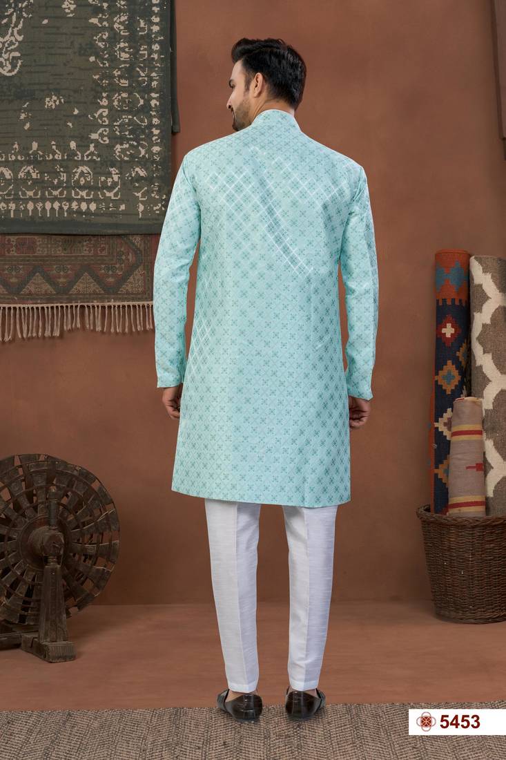 | Product Name | Firozi & Off Whitehavy Jacket Style Attached Indowestern Set With Thred Work & Fancy Botton | |