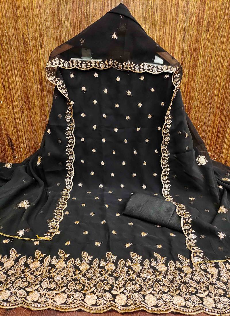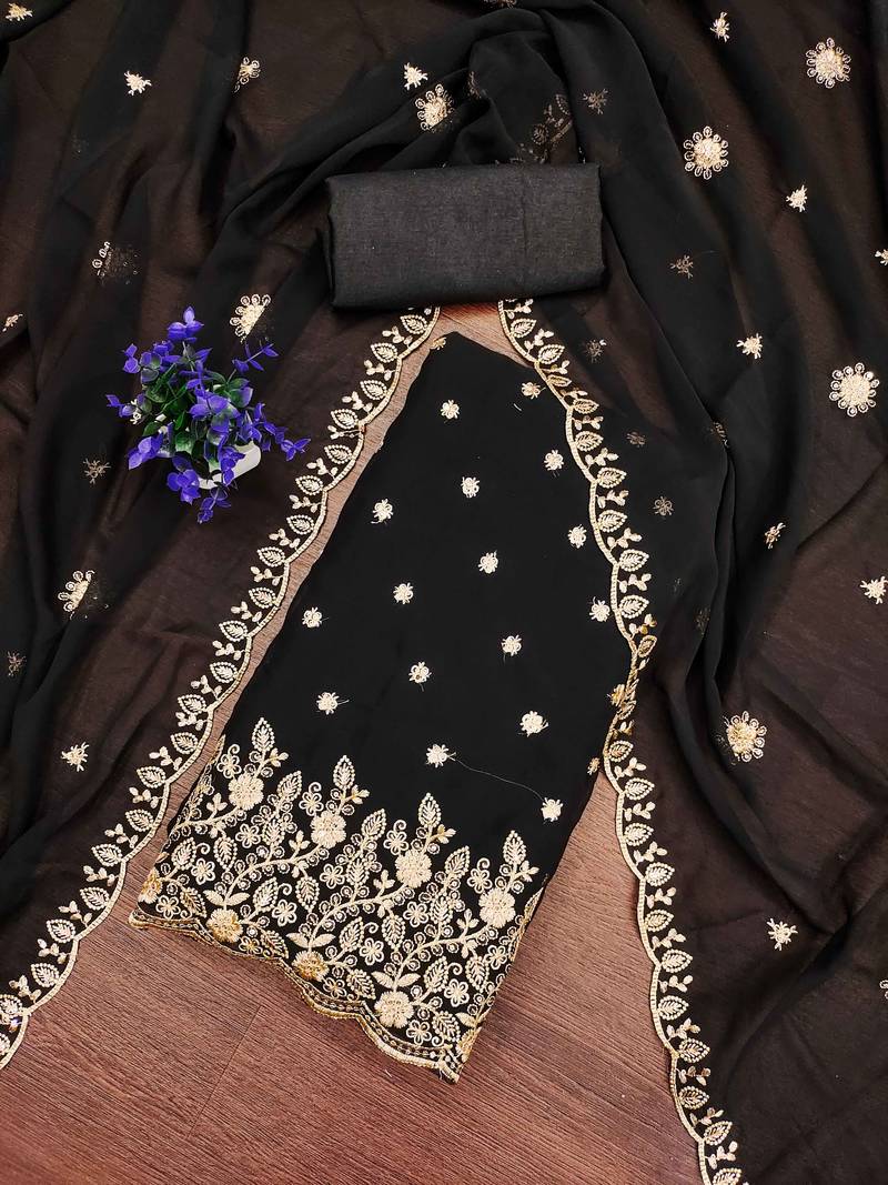 Trendsetting Heavy Thread Embroidery And Fancy Border With Embroidered Dupatta Straight Style 2.00 Mtr Unstitched Dress Material Top Of Black Colour Georgette Fabric With 2 Mtr Santoon As Lining Inner Fabric Also Including 3.60 Mtr Unstiched Bottom Material Of Black Colour Santoon Fabric With 2.00 Mtr Dupatta Of Black Colour Georgette Fabric By Shadow & Saining Brand
