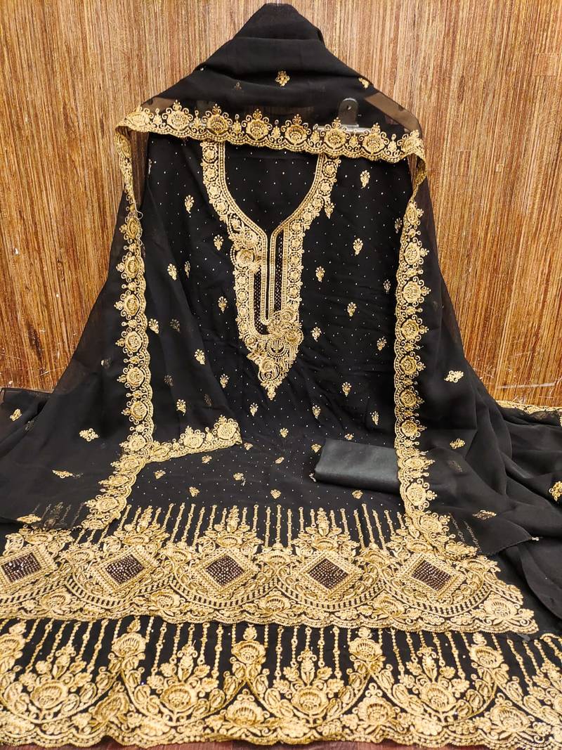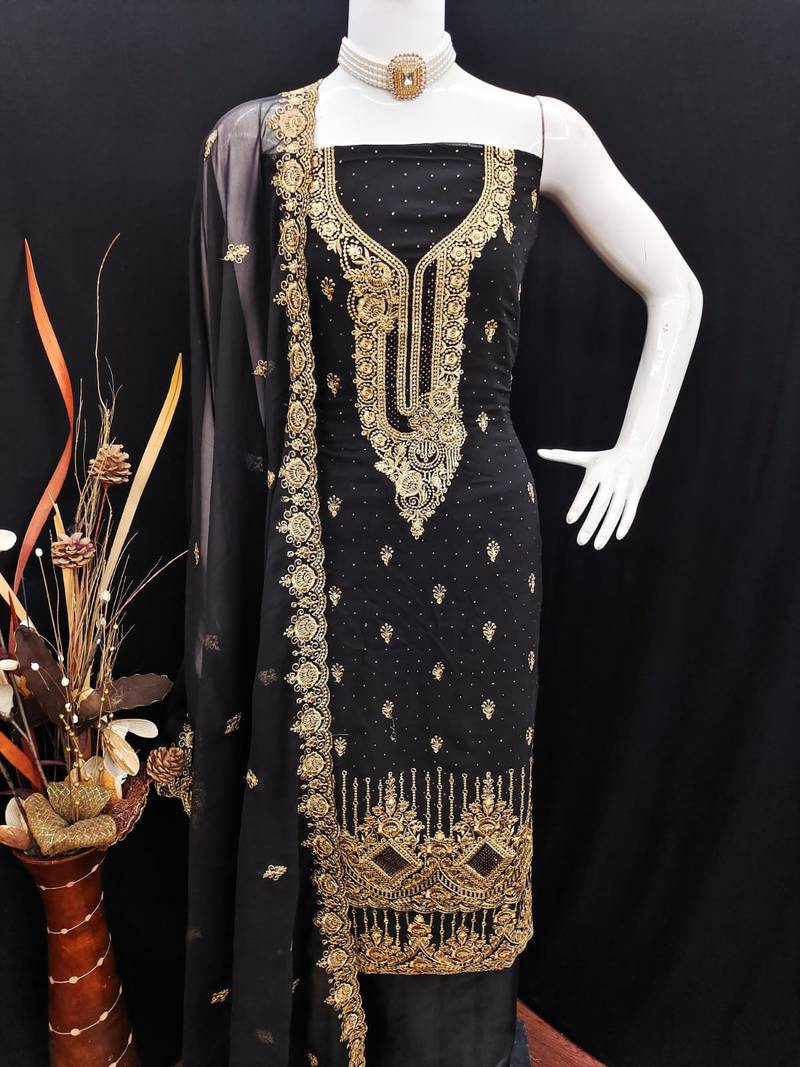 Awesome Heavy Zari Embroidery, Daimond And Fancy Border With Embroidered Dupatta Straight Style 1.80 Mtr Unstitched Dress Material Top Of Black Colour Georgette Fabric With 2 Mtr Crape As Lining Inner Fabric Also Including 3.80 Mtr Unstiched Bottom Material Of Black Colour Crape Fabric With 2.10 Mtr Dupatta Of Black Colour Georgette Fabric By Shadow & Saining Brand