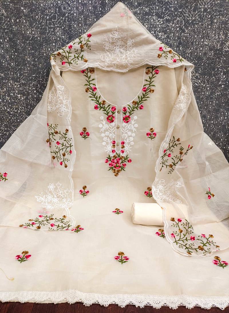 | Product Description | Soft Touch Heavy Thread Embroidery And Fancy Border With Designer Embroidered Dupatta Straight Style 2.00 Mtr Unstitched Dress Material Top Of Cream Colour Chanderi Cotton Fabric With 2 Mtr Santoon As Lining Inner Fabric Also Including 3.60 Mtr Unstiched Bottom Material Of Cream Colour Santoon Fabric With 2.00 Mtr Dupatta Of Cream Colour Chanderi Cotton Fabric By Shadow & Saining Brand |
