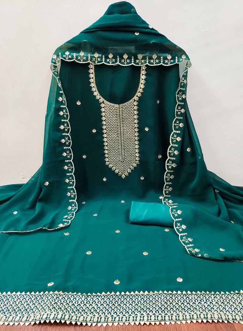 Exclusive Heavy Thread Embroidered And Fancy Border With Designer Embroidered Dupatta Straight Style 1.80 Mtr Unstitched Dress Material Top Of Green Colour Georgette Fabric With 2 Mtr Santoon As Lining Inner Fabric Also Including 3.60 Mtr Unstiched Bottom Material Of Green Colour Santoon Fabric With 2.10 Mtr Dupatta Of Green Colour Georgette Fabric By Shadow & Saining Brand
