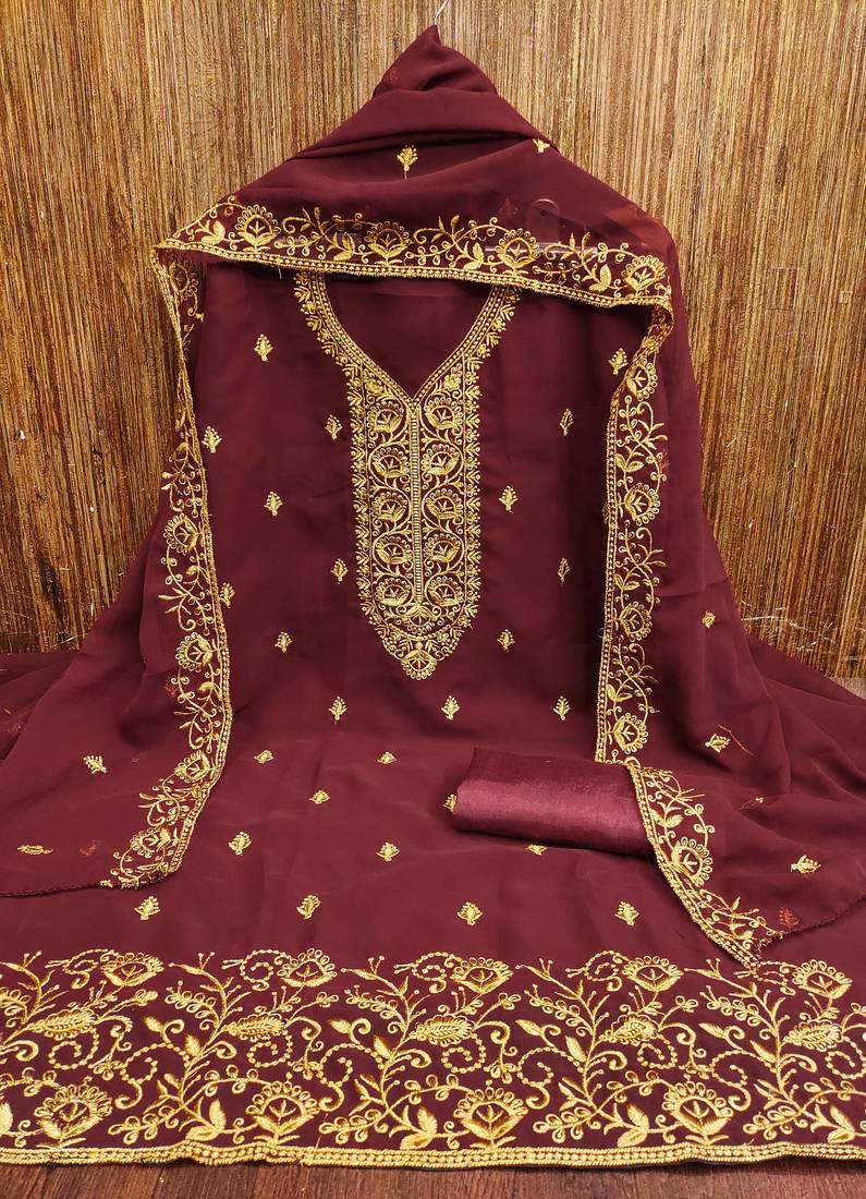 Exclusive Heavy Zari Embroidery And Fancy Border With Designer Embroidered Dupatta Straight Style 1.80 Mtr Unstitched Dress Material Top Of Maroon Colour Georgette Fabric With 2 Mtr Santoon As Lining Inner Fabric Also Including 3.60 Mtr Unstiched Bottom Material Of Maroon Colour Santoon Fabric With 2.10 Mtr Dupatta Of Maroon Colour Georgette Fabric By Shadow & Saining Brand
