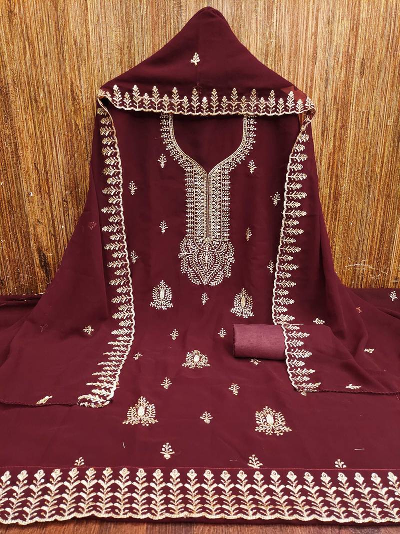 | Product Description | Charming Heavy Zari Embroidery And Fancy Border With Designer Embroidered Dupatta Straight Style 1.80 Mtr Unstitched Dress Material Top Of Maroon Colour Georgette Fabric With 2 Mtr Santoon As Lining Inner Fabric Also Including 3.60 Mtr Unstiched Bottom Material Of Maroon Colour Santoon Fabric With 2.10 Mtr Dupatta Of Maroon Colour Georgette Fabric By Shadow & Saining Brand |