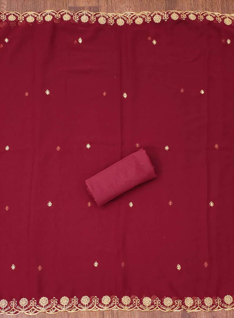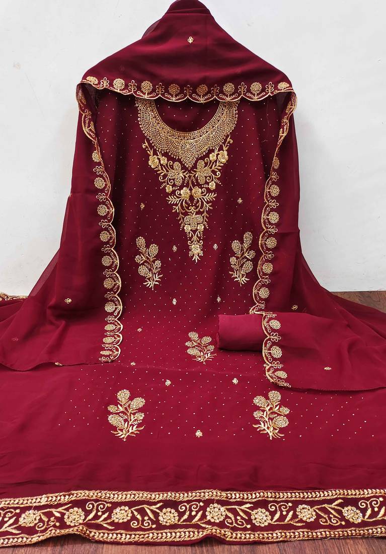 New Arrival Heavy Zari Embrodiery,Daimond And Fancy Border With Embroidered Dupatta Straight Style 2.00 Mtr Unstitched Dress Material Top Of Maroon Colour Georgette Fabric With 2 Mtr Crape As Lining Inner Fabric Also Including 3.60 Mtr Unstiched Bottom Material Of Maroon Colour Crape Fabric With 2.00 Mtr Dupatta Of Maroon Colour Georgette Fabric By Shadow & Saining Brand