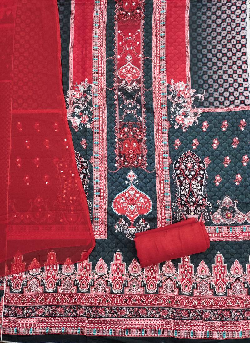 Chic Designer Print And Mirror Work With Stylish Dupatta Straight Style 2.00 Mtr Unstitched Dress Material Top Of Multi Colour Rayon Fabric Also Including 2.00 Mtr Chudidar Style Bottom Piece Material Of Red Colour Rayon Fabric With 2.00 Mtr Dupatta Of Red Colour Nazneen Fabric By Shadow & Saining Brand