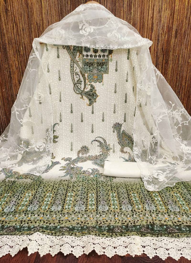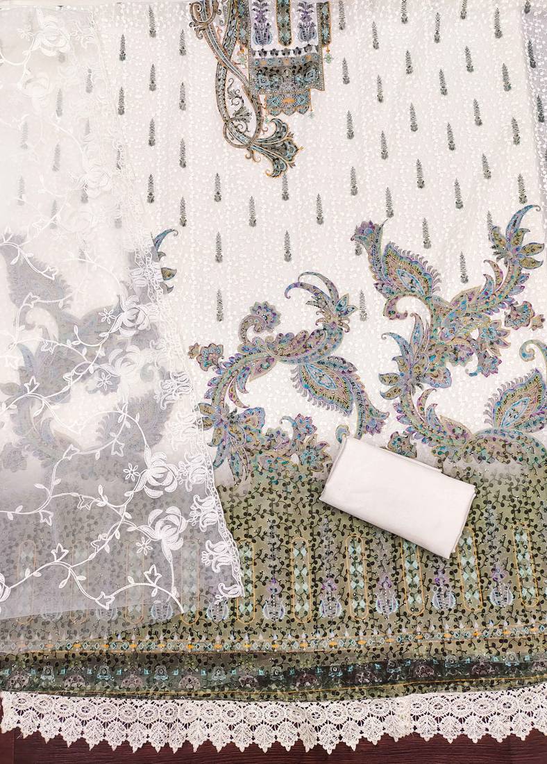 | Product Description | Wedding Perfect Heavy Thread Sequence Embroidery And Fancy Border With Stylish Dupatta Straight Style 2.00 Mtr Unstitched Dress Material Top Of Multi Colour Georgette Fabric With 2 Mtr Santoon As Lining Inner Fabric Also Including 3.60 Mtr Unstiched Bottom Material Of White Colour Santoon Fabric With 2.00 Mtr Dupatta Of White Colour Net Fabric By Shadow & Saining Brand |
