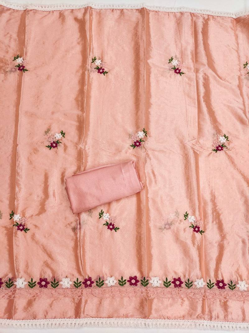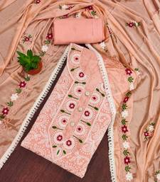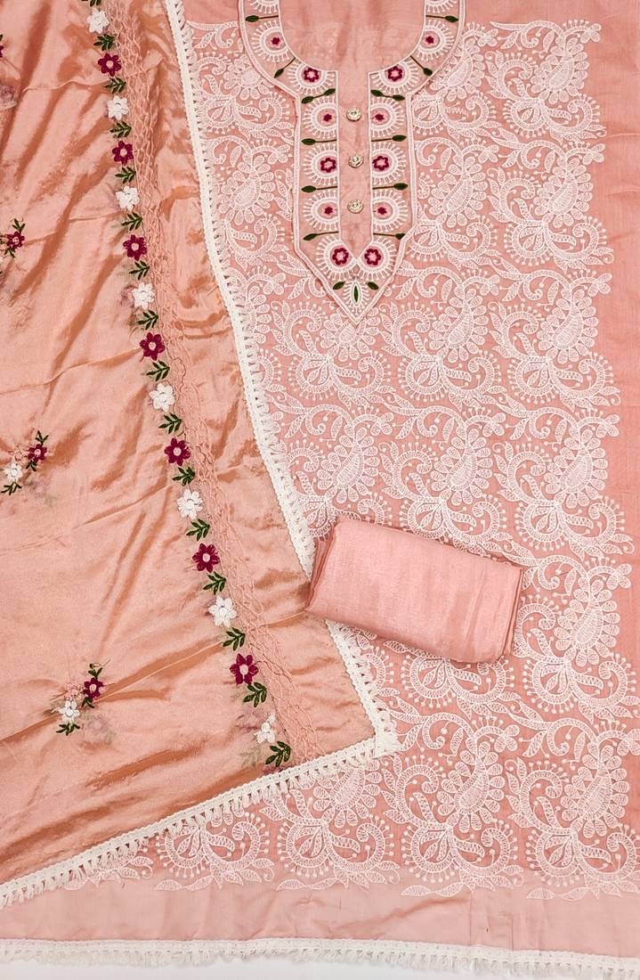 Sophisticated Heavy Thread Embroidery And Fancy Border With Designer Embroidered Dupatta Straight Style 2.00 Mtr Unstitched Dress Material Top Of Peach Colour Chanderi Cotton Fabric With 2 Mtr Santoon As Lining Inner Fabric Also Including 3.60 Mtr Unstiched Bottom Material Of Peach Colour Santoon Fabric With 2.00 Mtr Dupatta Of Peach Colour Nazneen Fabric By Shadow & Saining Brand