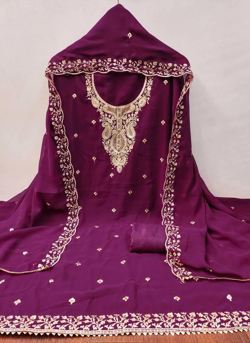 | Product Description | Designer Heavy Thread Embroidered And Fancy Border With Designer Embroidered Dupatta Straight Style 1.80 Mtr Unstitched Dress Material Top Of Purple Colour Georgette Fabric With 2 Mtr Santoon As Lining Inner Fabric Also Including 3.60 Mtr Unstiched Bottom Material Of Purple Colour Santoon Fabric With 2.10 Mtr Dupatta Of Purple Colour Georgette Fabric By Shadow & Saining Brand |