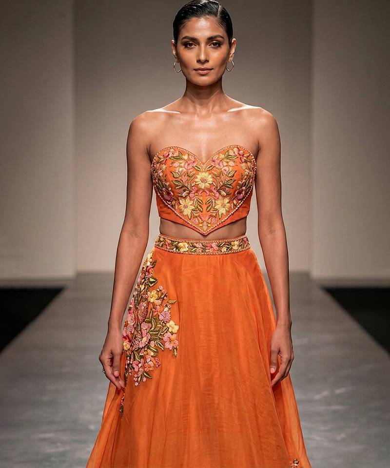 Tangerine orange embroidered raw silk lehenga set