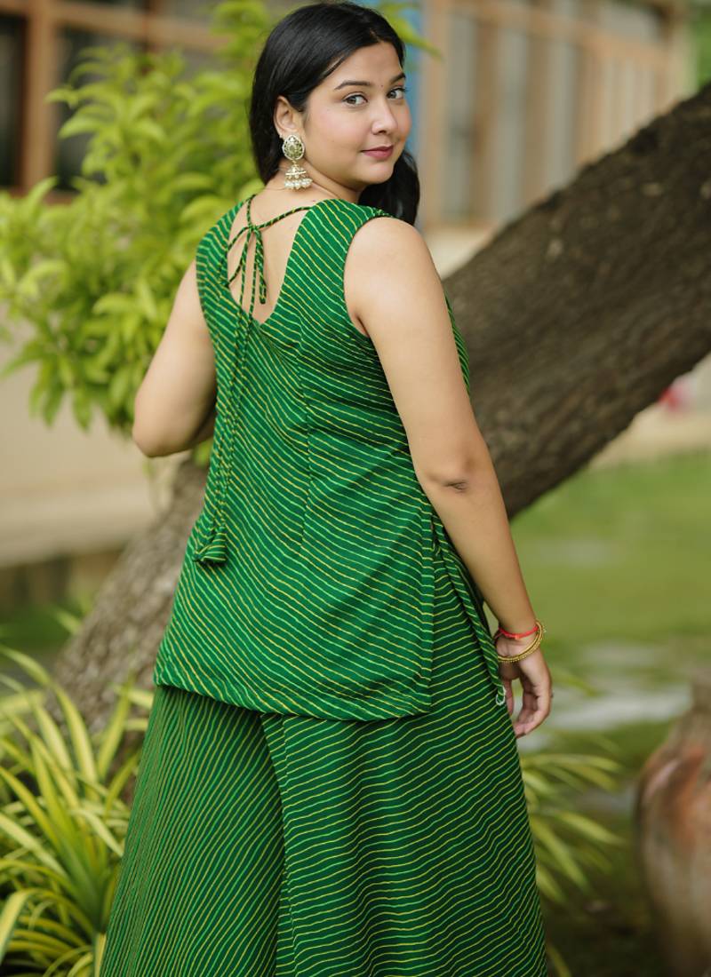 Product Description | Drape Yourself In Festive Freshness With This Vibrant Green Leheriya Sharara Style Kurta Set. Its Breezy Silhouette And Timeless Ethnic Charm Make It The Perfect Blend Of Comfort And Style – Ideal For Celebrations, Get Togethers, Or Just A Chic Day Out.” |