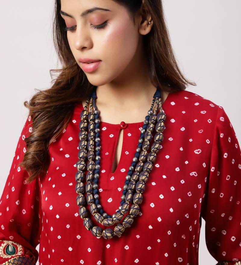 | Product Description | This Bandhani Print Round Neck Asymmetric Modal Silk Kurta In Red Colour With Embroidery On Sleeves And Brocade Trim Is Paired With Contrasting Embroidery Pants. It Is A Stylish Ensemble Perfect For Festivity. |