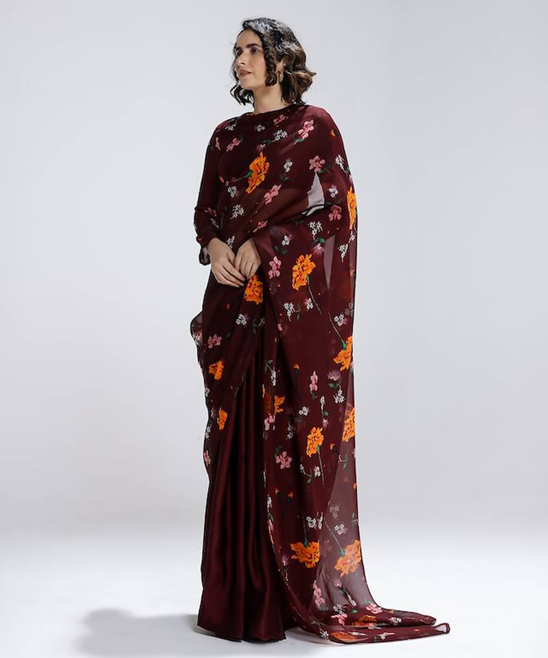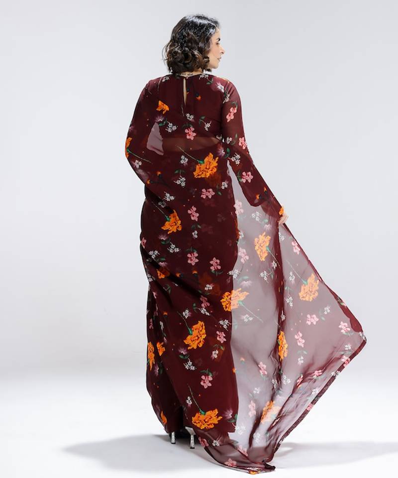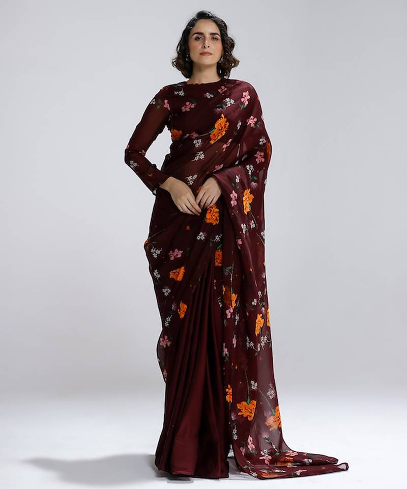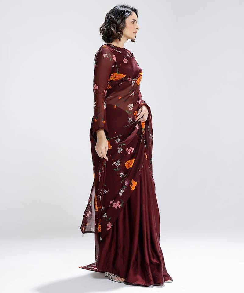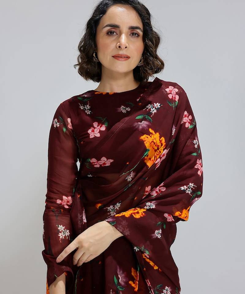 | Product Description | This Marron Printed Organza Saree Radiates Delicate Elegance With Its Sheer, Lightweight Texture And Graceful Drape. The Refreshing Blue Hue Paired With Artistic Prints Adds A Modern, Festive Charm. Perfect For Celebrations, Daytime Events, And Special Occasions, It Blends Sophistication With Effortless Style For A Beautifully Refined Look.