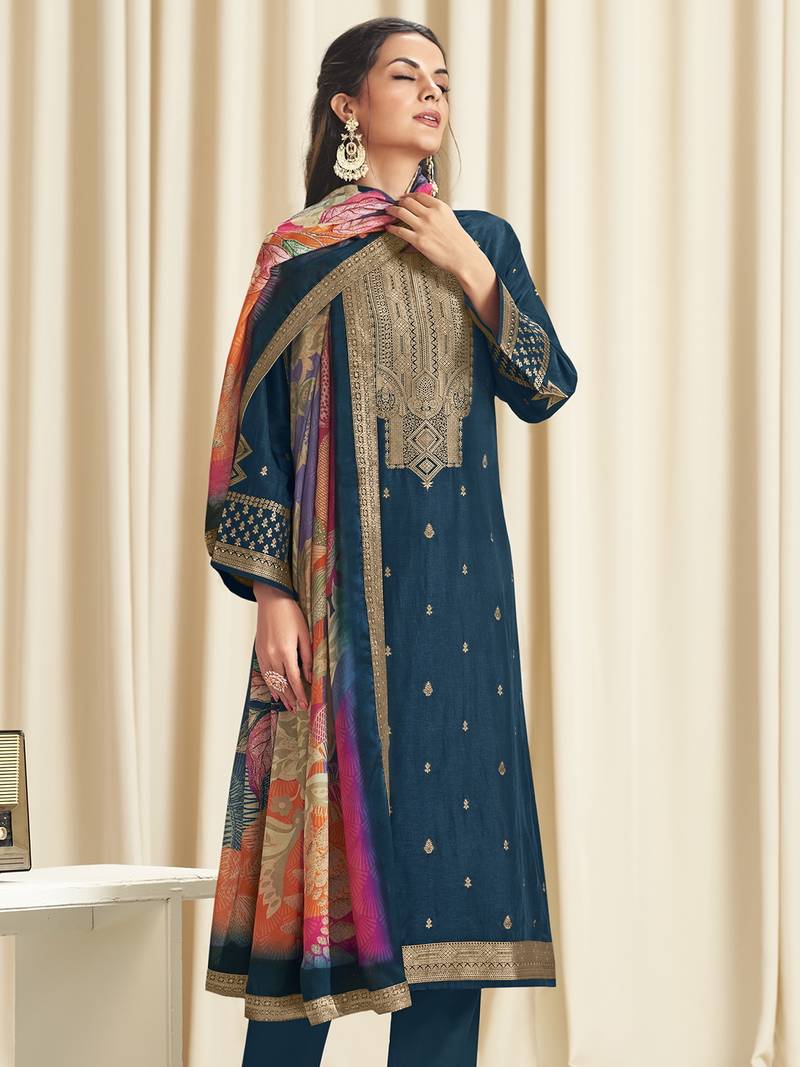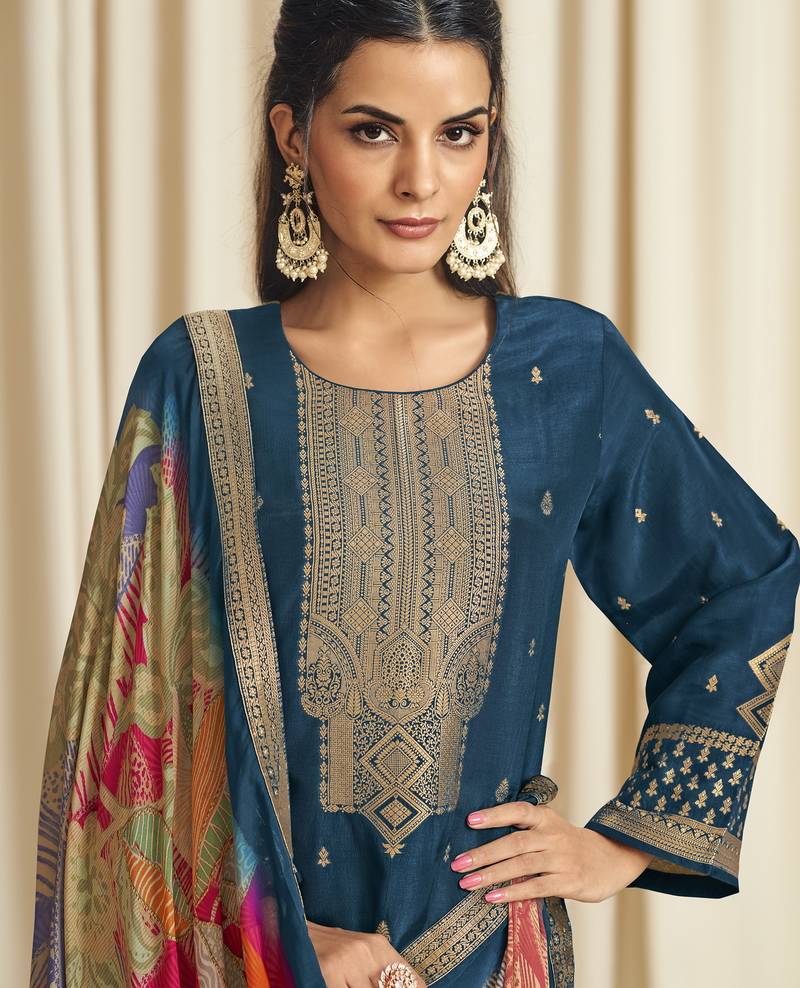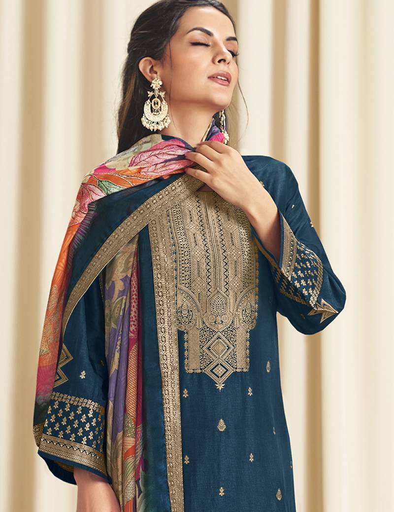 | Product Name | Navy Blue Dola Silk Jacquard Digital Printed Dress Material | |