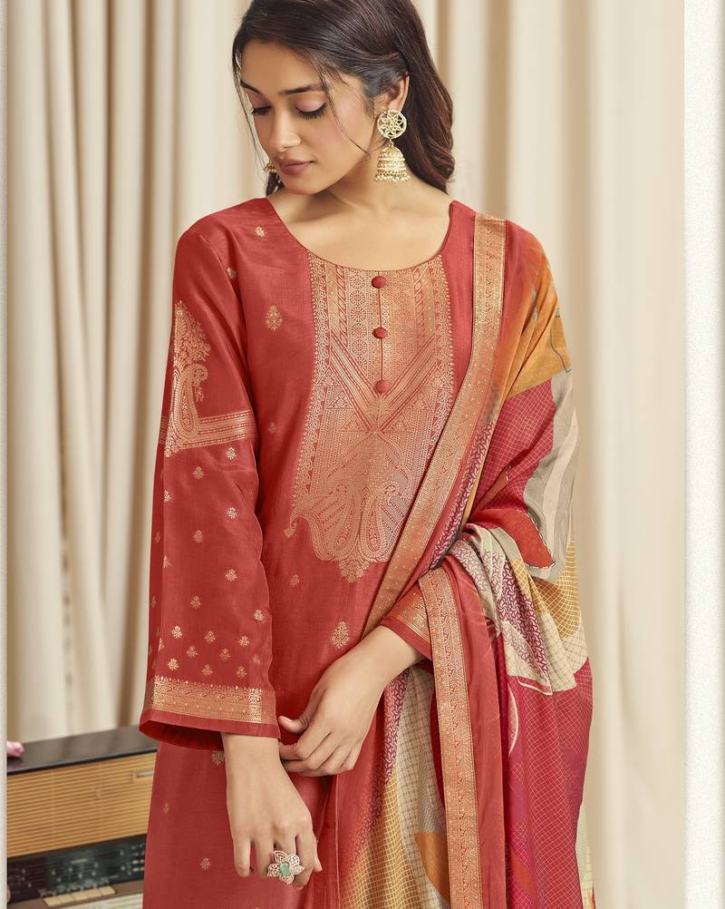 | Product Description | Allover Traditional Jaquard Woven Design With Contrast Digital Printed Dupatta & Ready Lace |