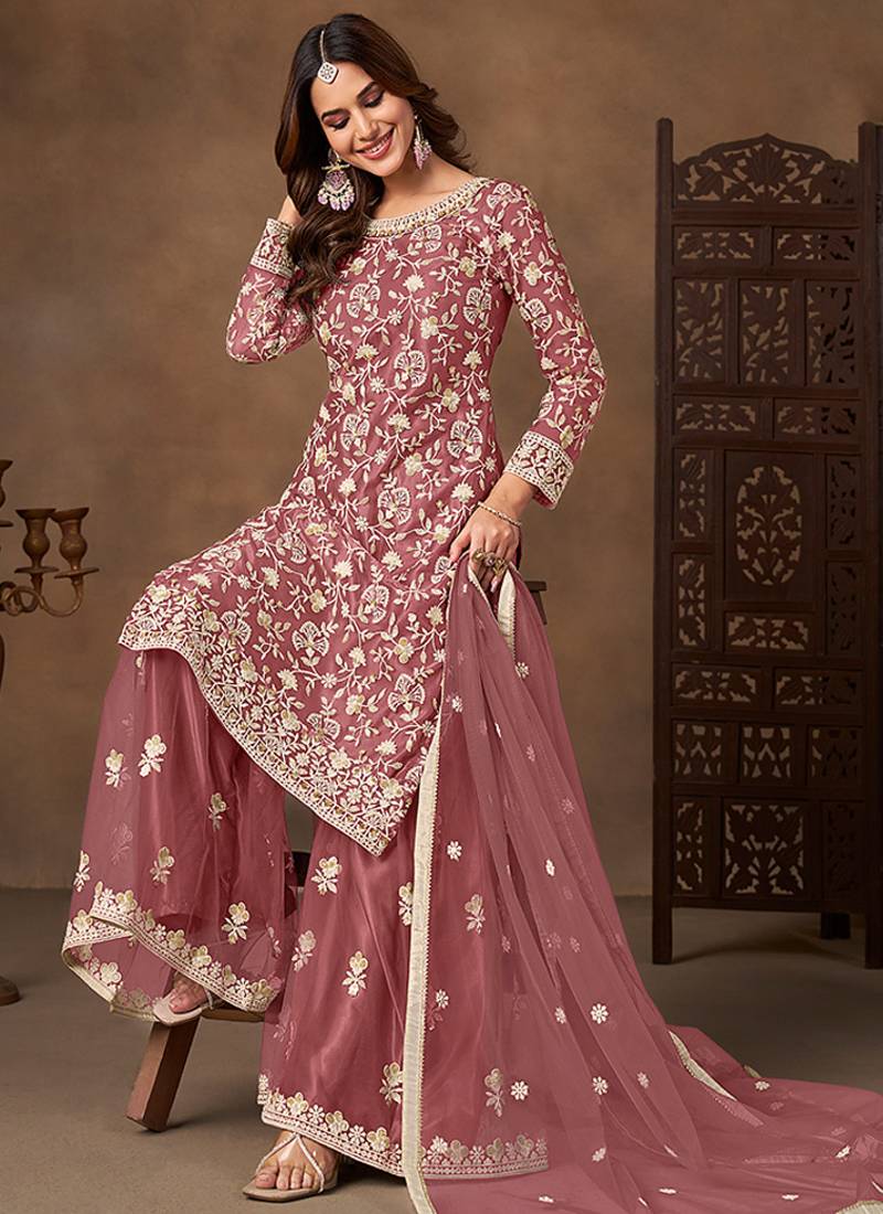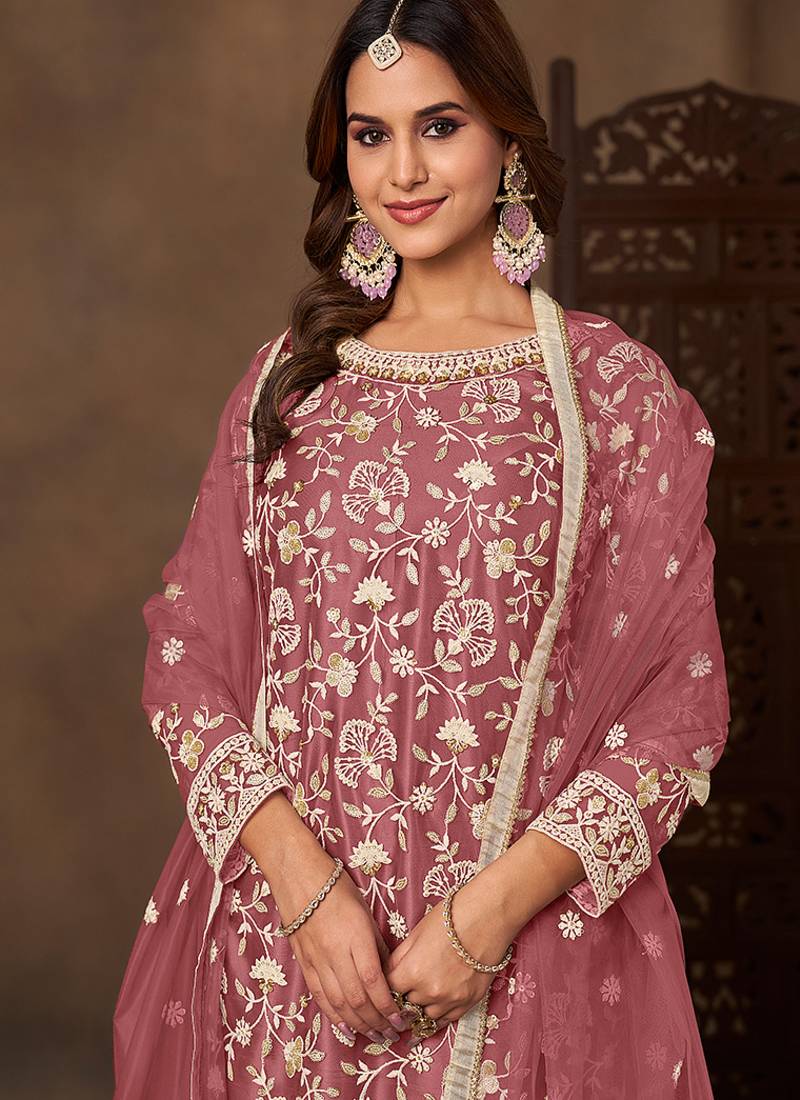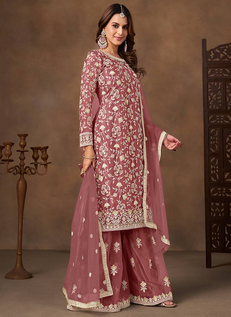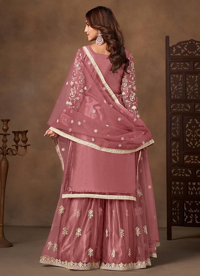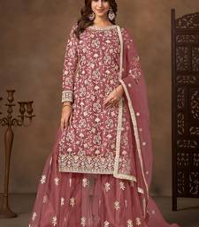 Dark peach embroidered net sharara style semi stitched