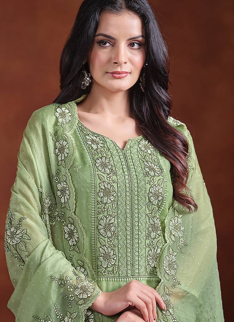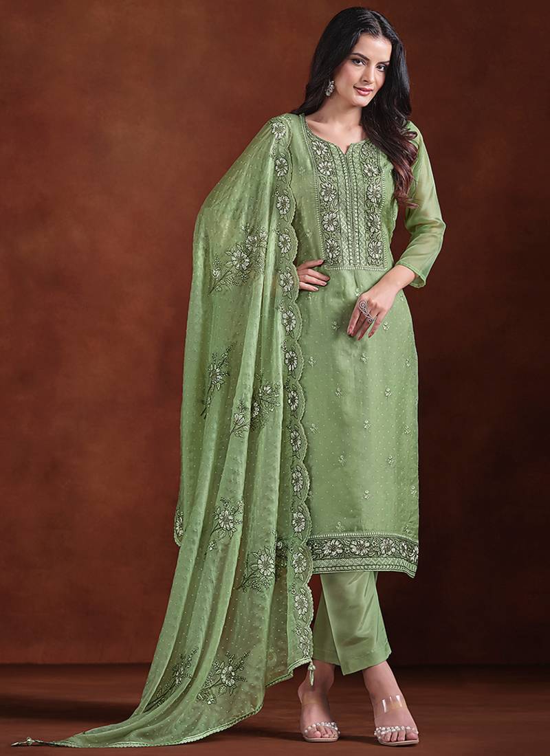 Green embroidered & jarkan organza straight cut salwar kameez for women semi stitched
