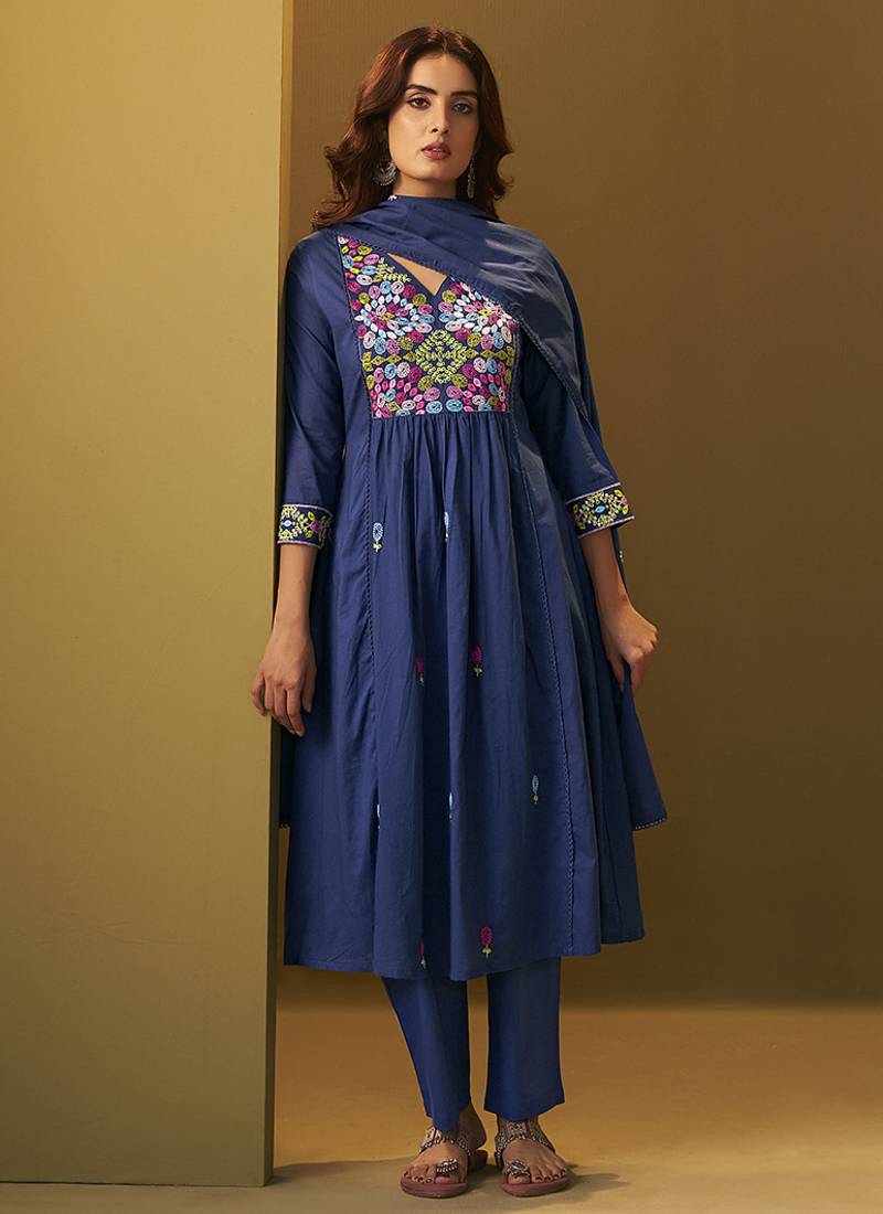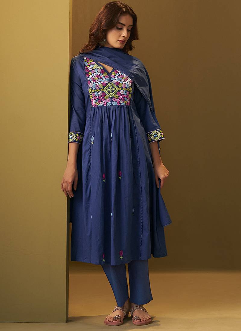 Navy blue embroidery pure cotton flared kurta set with dupatta stitched