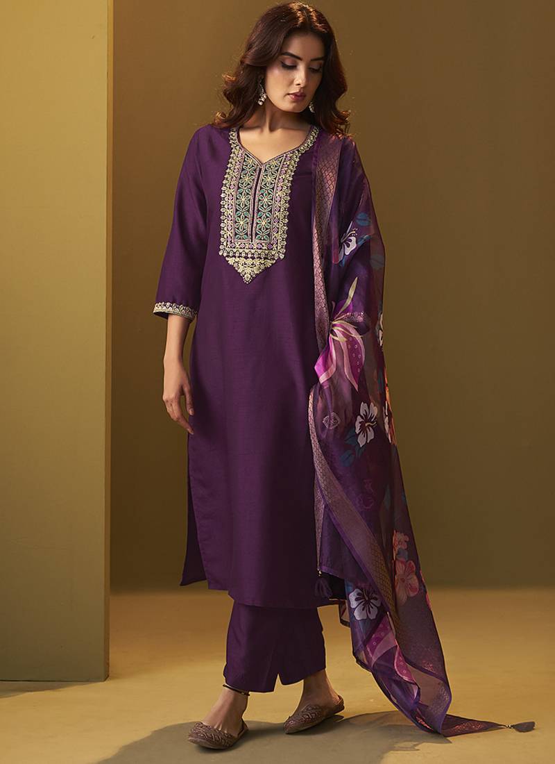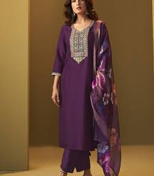 Purple embroidery cotton blend straight kurta set with printed dupatta stitched