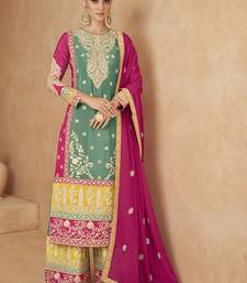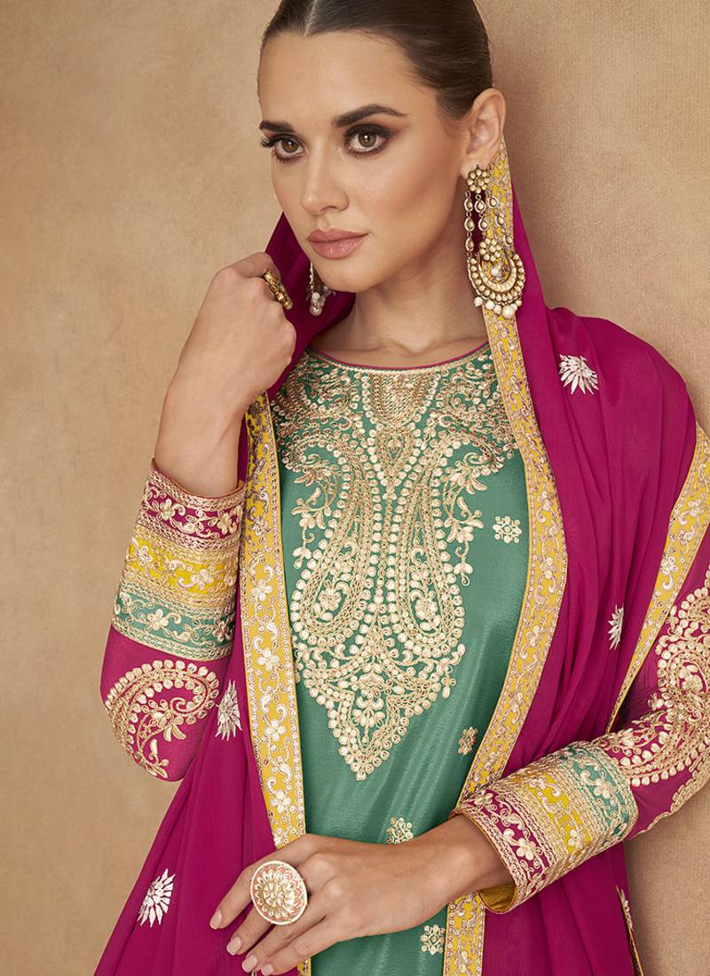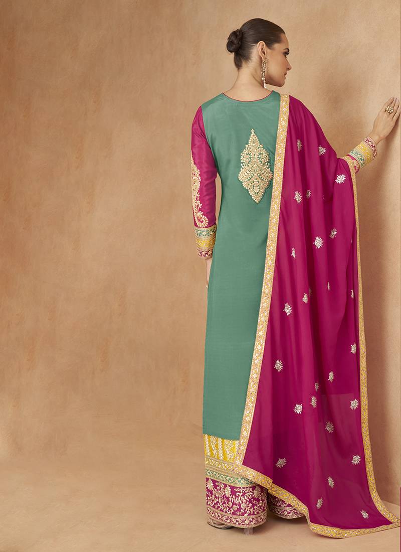 Sea green embroidered chinon silk palazzo suit semi stitched