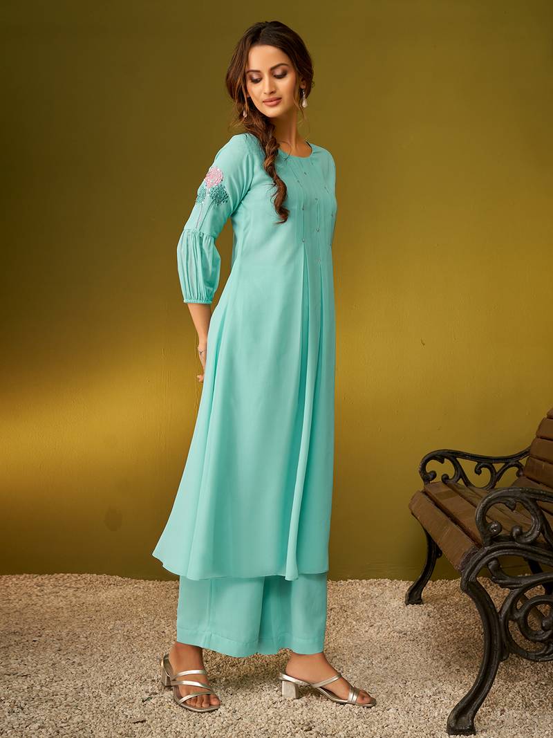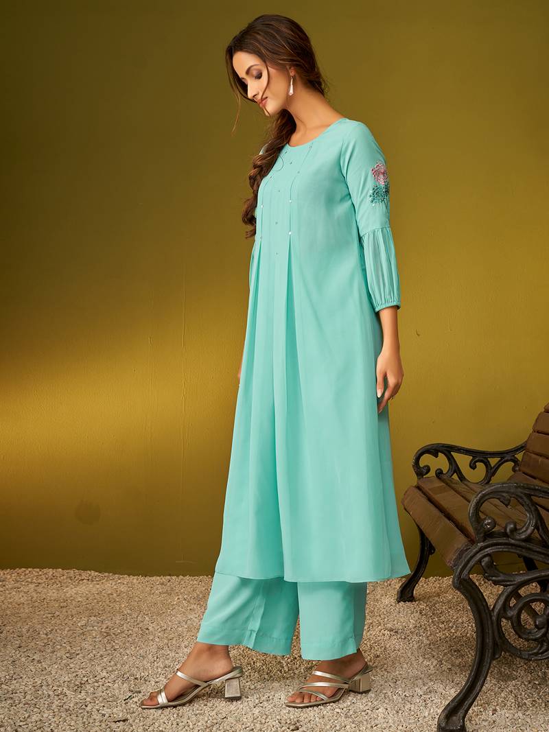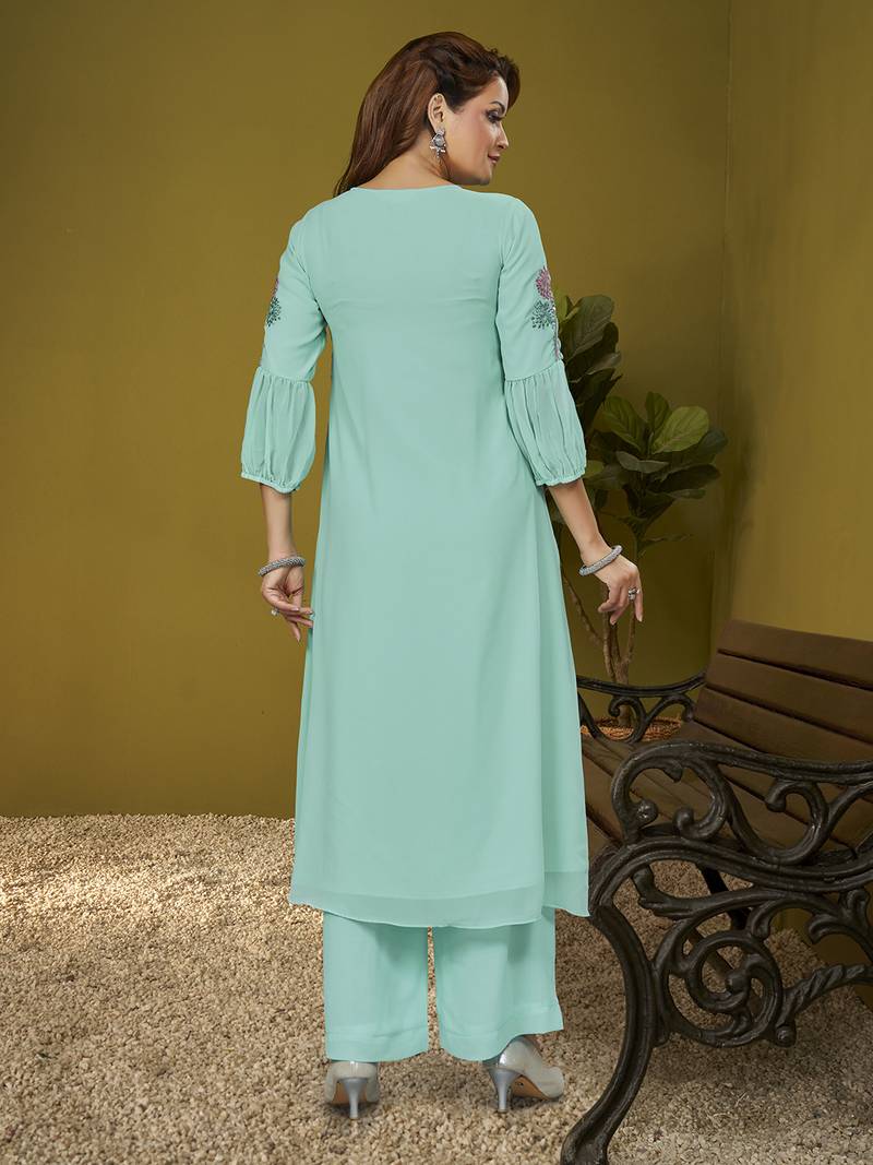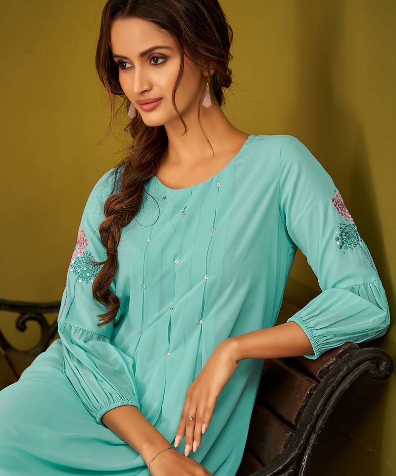 | Product Name | Sky Blue Solid & Embroidered Georgette Kurti | |