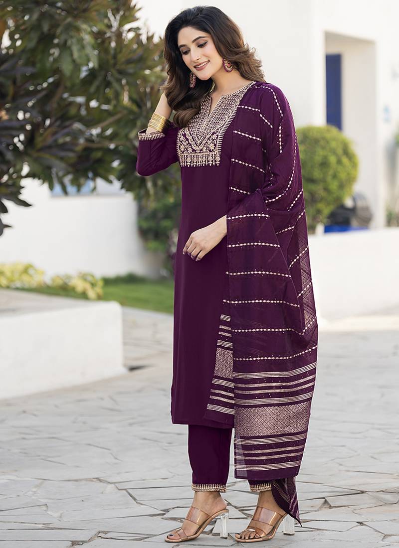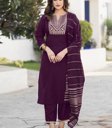 Wine embroidered chinon straight kurta set with dupatta stitched
