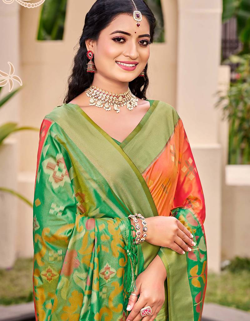 Exquisite orange & green pochampalli soft silk blend saree with grand ikat woven pallu