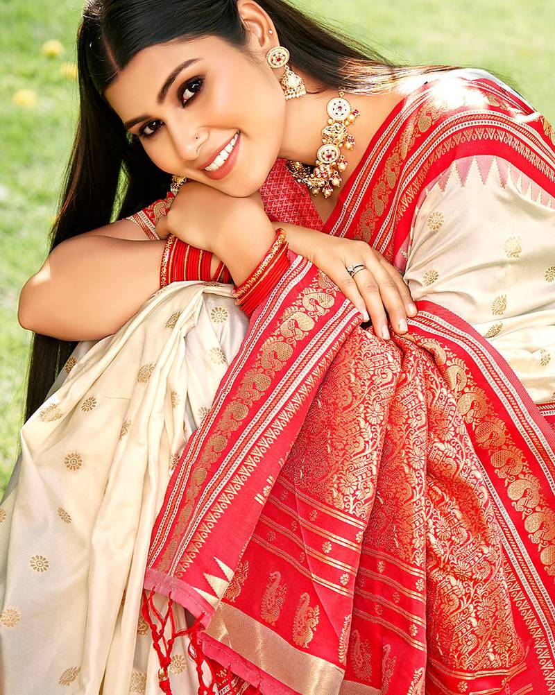 Graceful cream banarasi silk blend saree with golden zari woven border & floral jaal wedding & festive wear