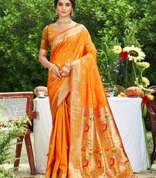 Graceful orange banarasi silk blend saree with golden zari woven border & floral jaal wedding & festive wear