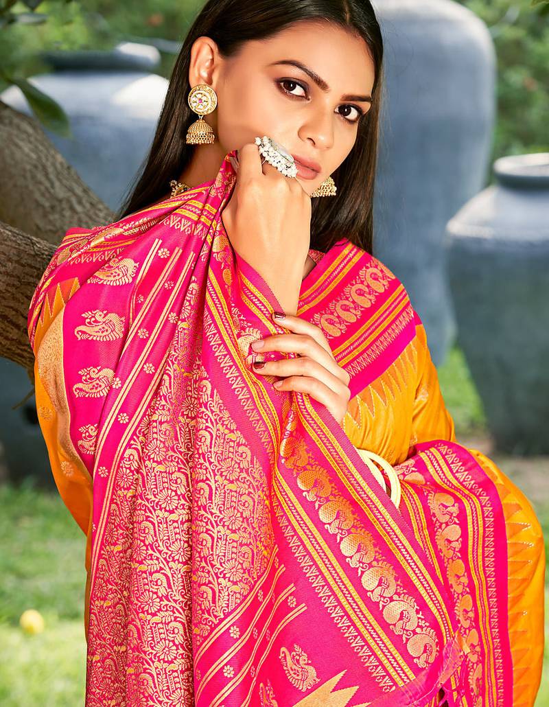 Graceful yellow banarasi silk blend saree with golden zari woven border & floral jaal wedding & festive wear