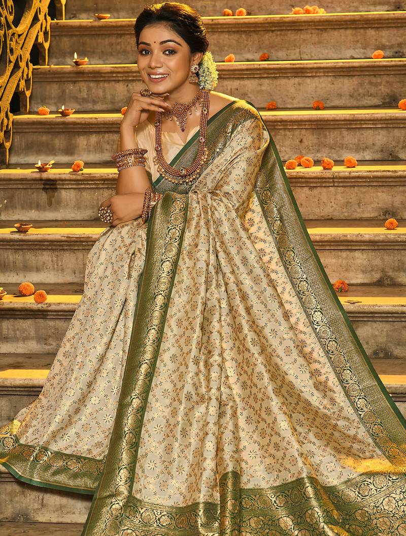 Ivory and green banarasi silk blend saree with golden zari – regal elegance for timeless celebrations