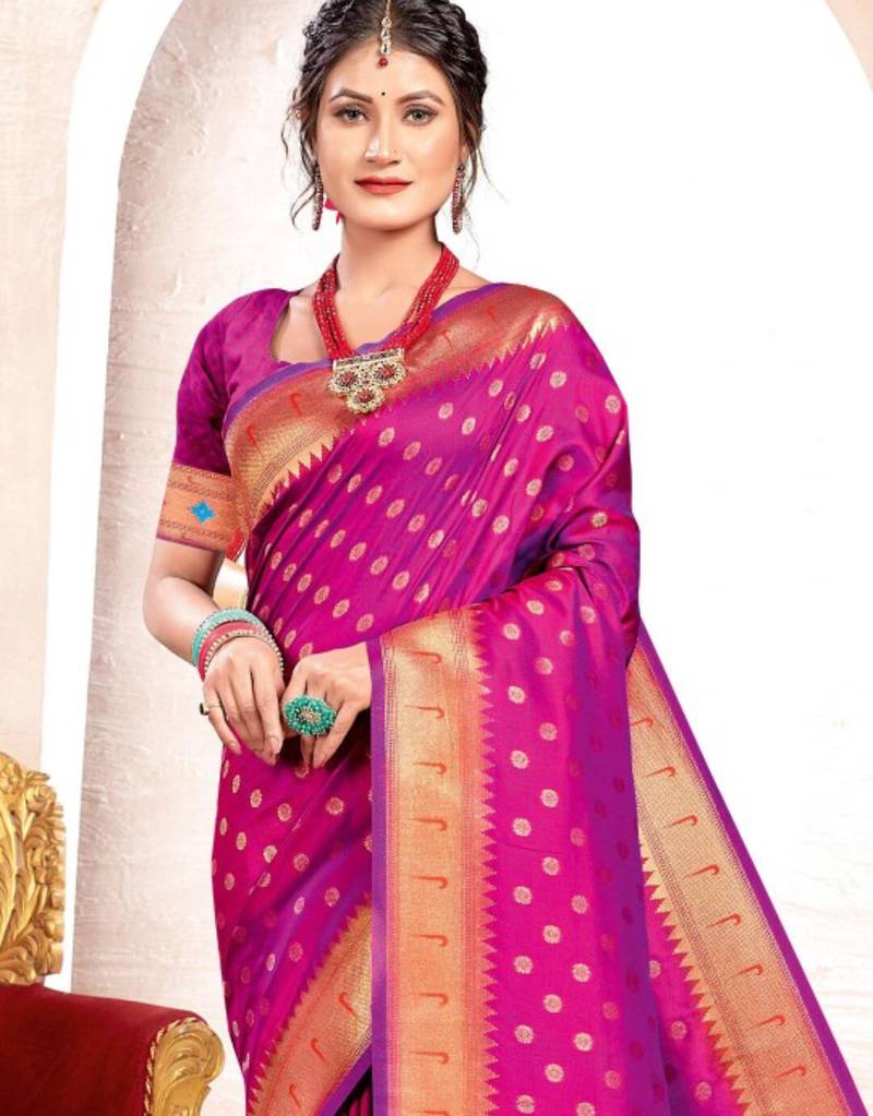 Product Name Purple Kanjivaram Silk Blend Saree With Golden Zari And Colorful Peacock Woven Pallu Design