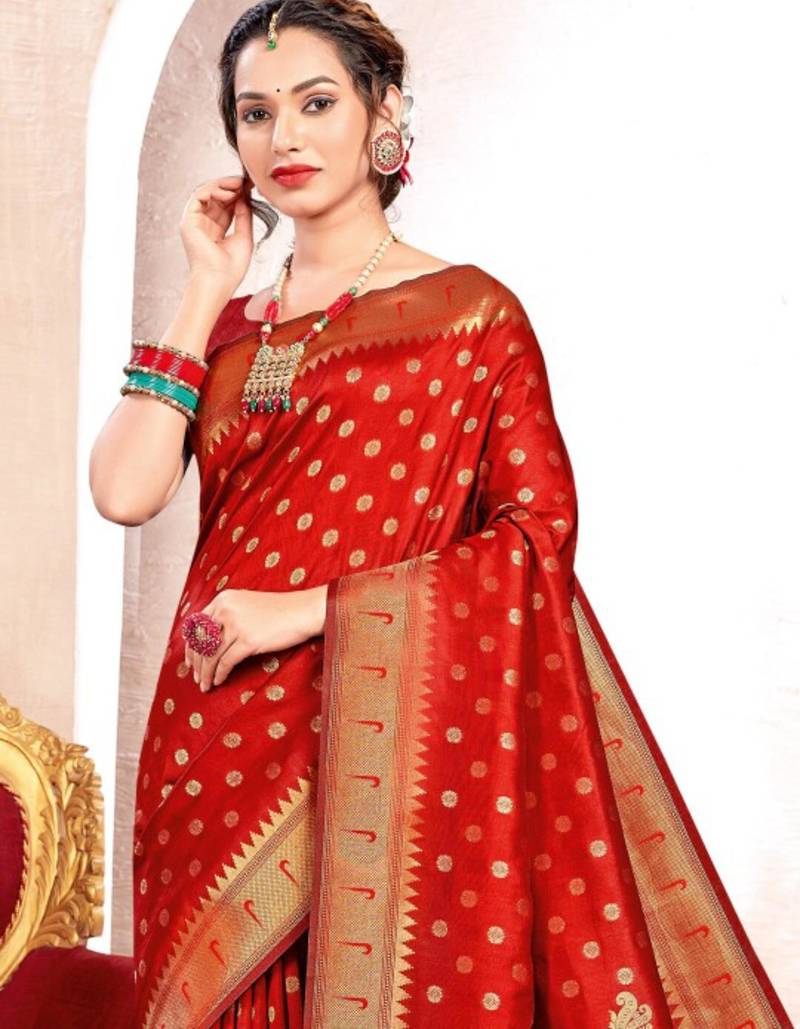 | Product Name | Red Kanjivaram Silk Blend Saree With Golden Zari And Colorful Peacock Woven Pallu Design | |