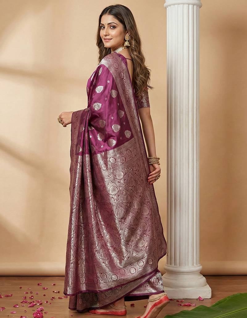 Sutriti magenta wine soft silk saree with silver zari details