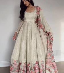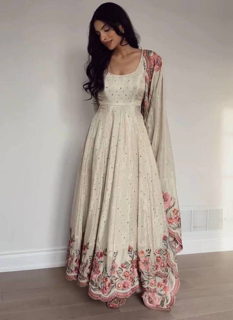 | Product Name | Cream Chinnon Silk Embroidery And Sirosky Work Party Wear Gown | |