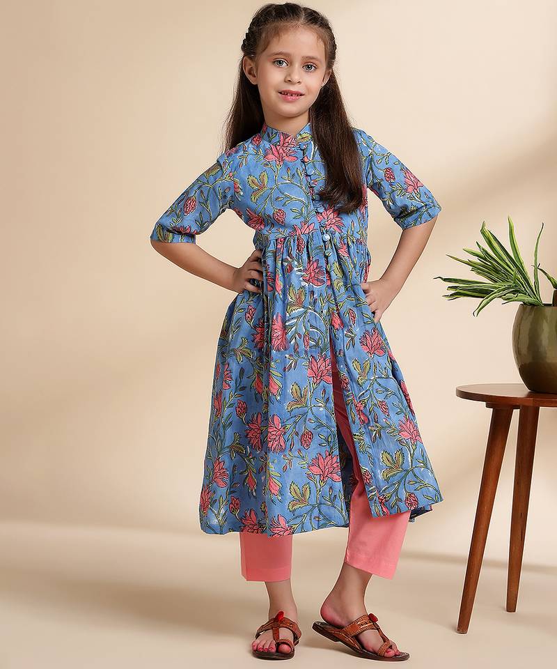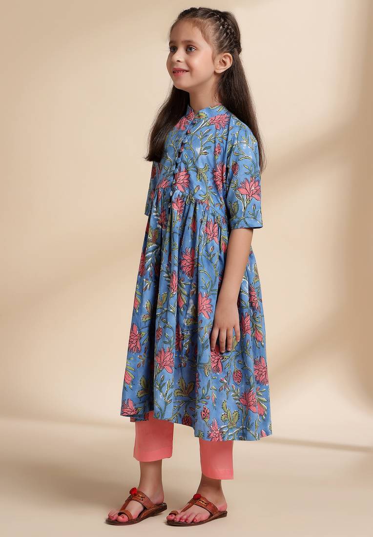 Blue printed cotton kurta set