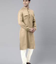Beige cotton pathani kurta pajama with patch pocket