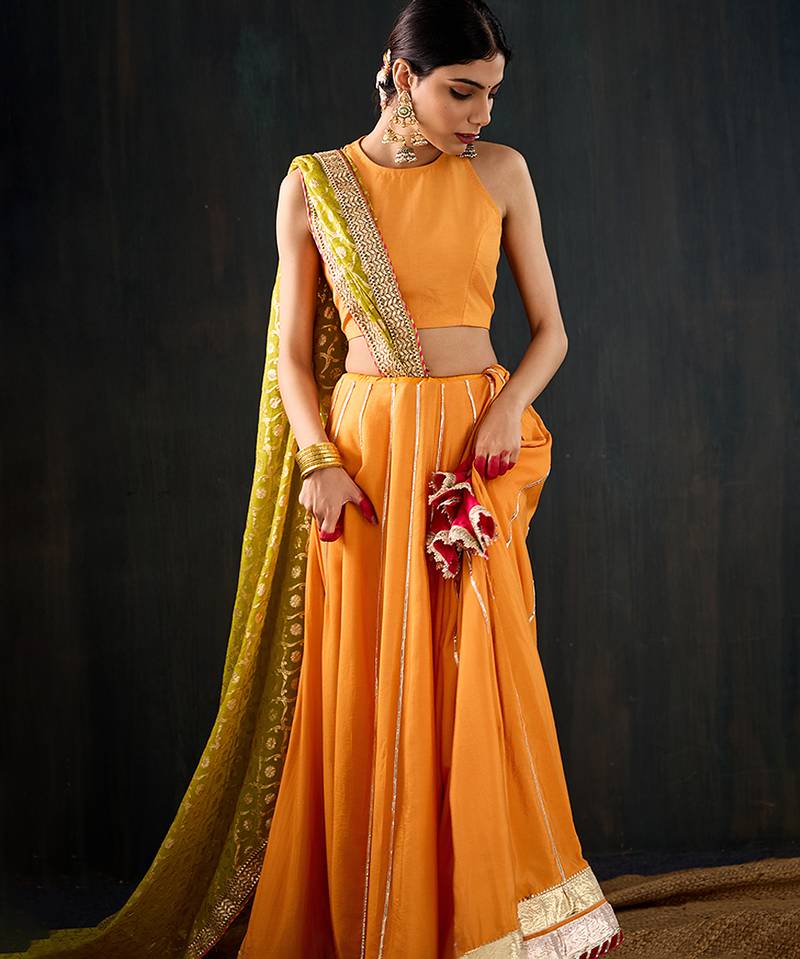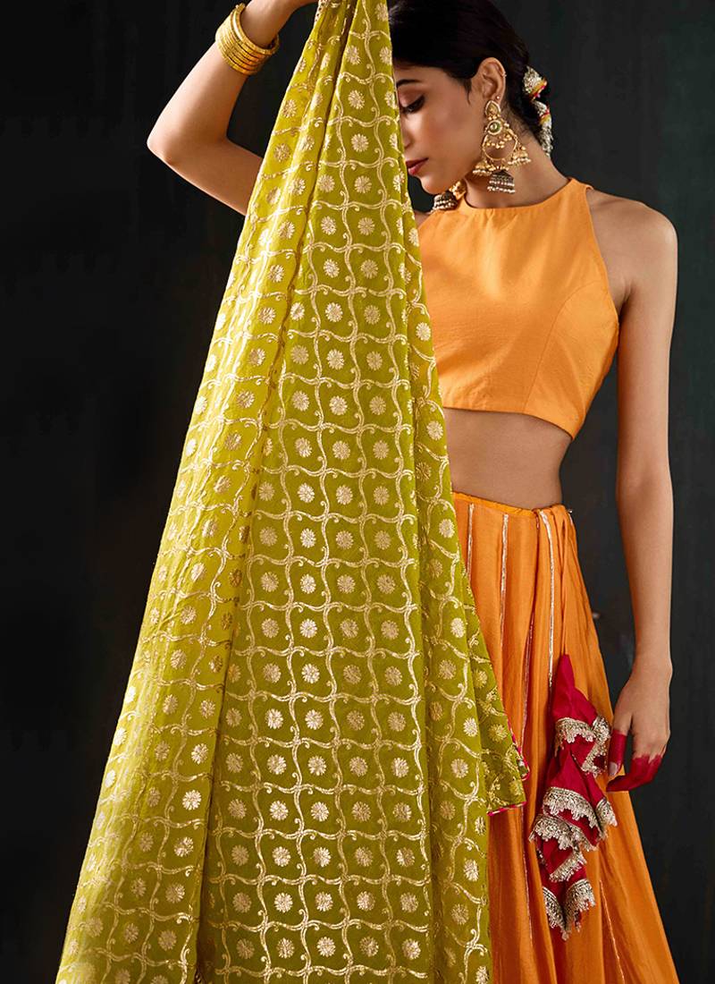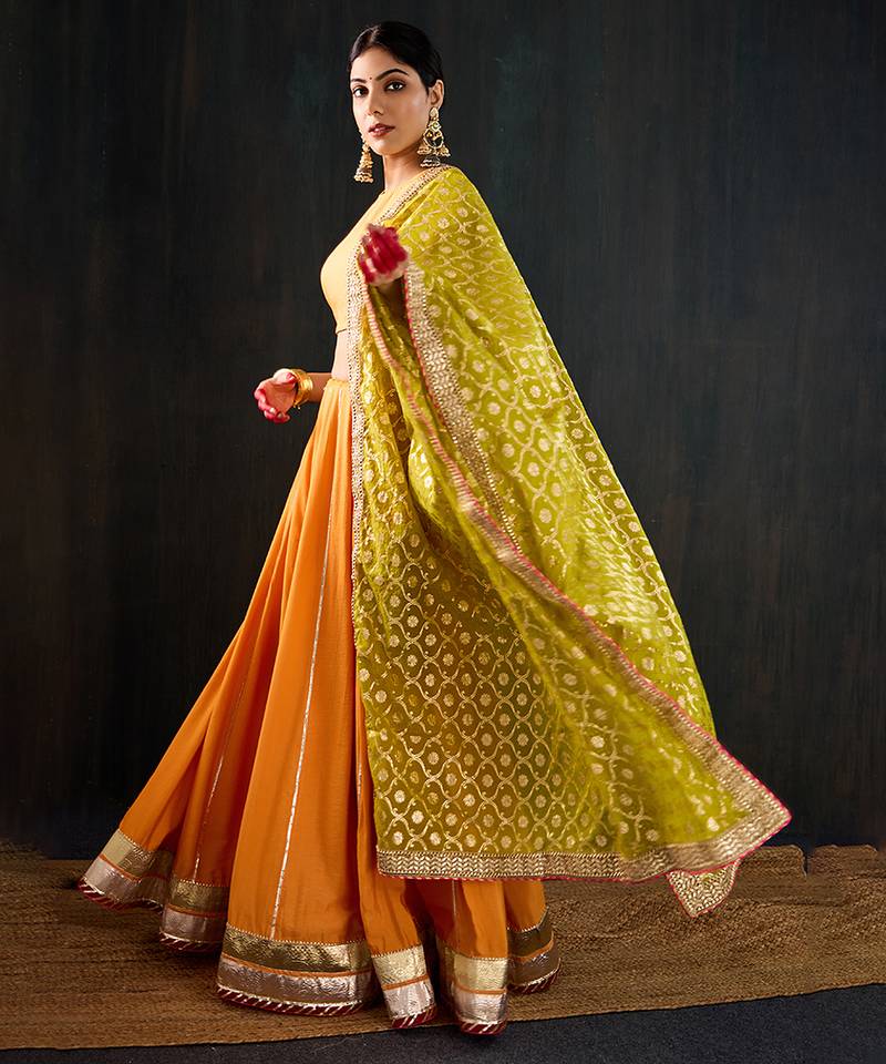 Product Description | Lehenga: Orange Lehenga Adorned With Gota Work All Over And Pretty Latkans On The Sides.Blouse: Orange Sleeveless Blouse.Dupatta: Statement Contrast Chanderi Dupatta In Parrot Green With Jaal Jacquard Work And Gota Lace Detailing.Pairing & Occasion: Ideal For Weddings, Festive Celebrations, Or Special Occasions. Pair With Statement Earrings, Bangles, And Juttis For A Traditional Look, Or Heels For A Modern Festive Style.