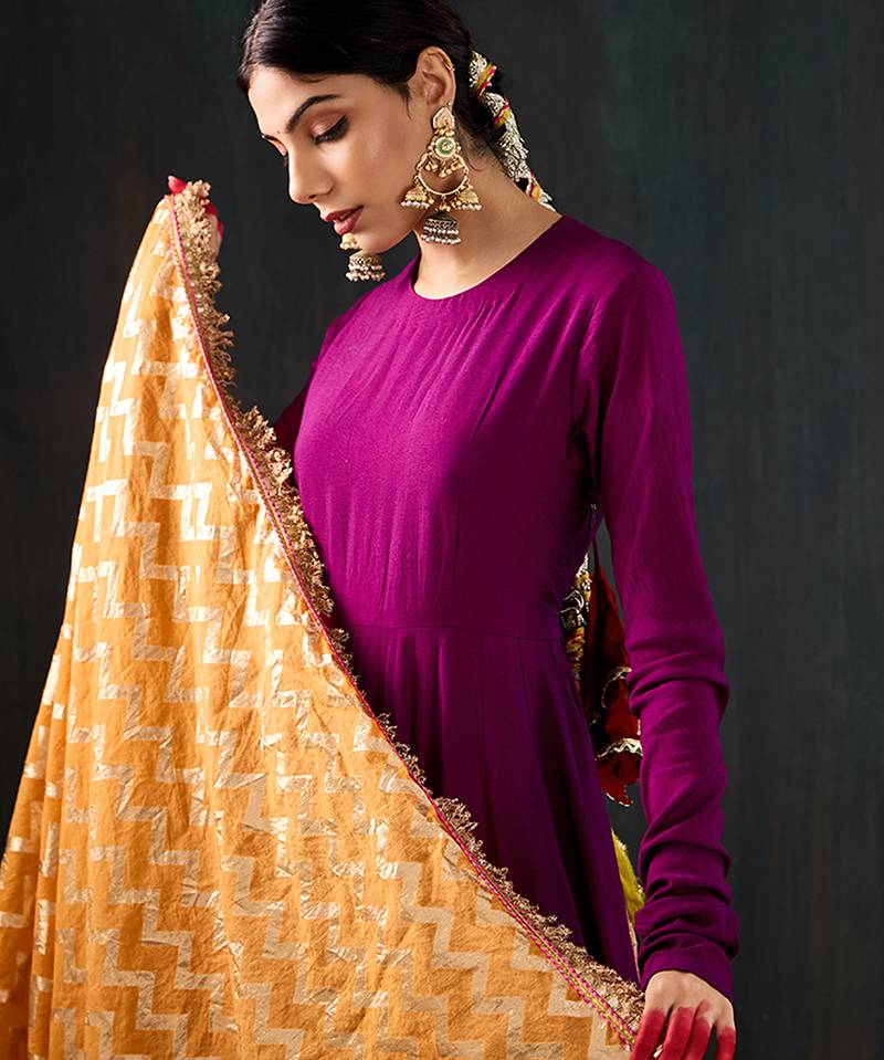 Product Description | Kurta: Purple Anarkali With Delicate Gota Work Along The Hem. Features A Simple Front Neckline And A Wide Open Back With A Pretty Latkan Tie Up. Made In Soft, Flowy Fabric For A Comfortable And Elegant Fit. Pant: Simple Churidar That Goes Perfectly With The Kurta. Dupatta: Contrast Orange Chanderi Dupatta With Leheriya Jacquard Work And Jhallar Lace Detailing.